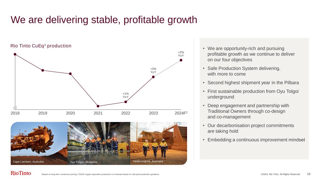 ©2024, Rio Tinto, All Rights Reserved 17 Attractive dividends remain paramount • $4.2 bn of dividends declared for H2, bringing the full year to $7.1 bn • 60% payout, in line with our policy • Consistent track record of shareholder returns • 60% average payout on ordinary dividend over the past eight years • Total payout ratio has averaged 71% over the past eight years • Net debt remains flat YoY at $4.2 bn Shareholder returns policy of 40-60% of underlying earnings on average through the cycle Payout ratio (%) 60 60 60 60 60 60 60 60 10 23 12 10 12 19 2016 2017 2018 2019 2020 2021 2022 2023 Ordinary dividend Additional return 1Shareholder returns on a declared basis, excluding divestment proceeds returned to shareholders 1