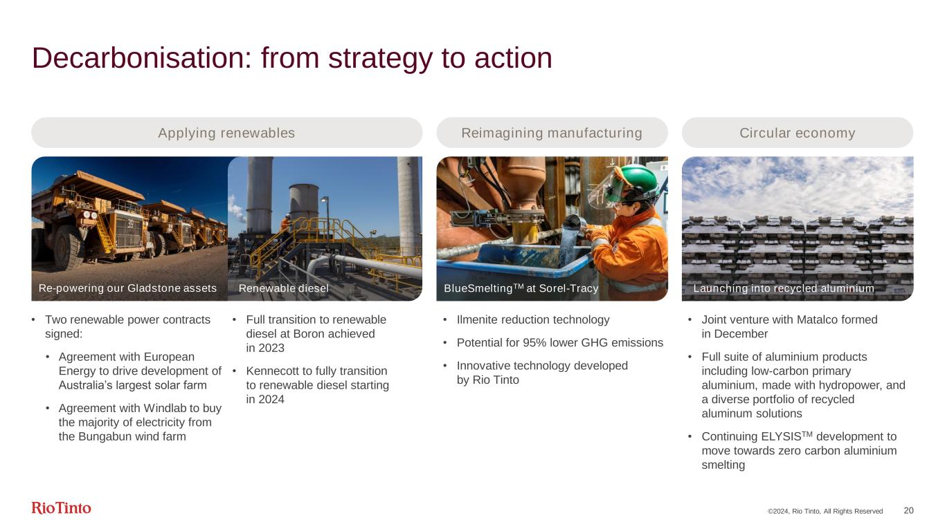 ©2024, Rio Tinto, All Rights Reserved 19 We are delivering stable, profitable growth Rio Tinto CuEq1 production • We are opportunity-rich and pursuing profitable growth as we continue to deliver on our four objectives • Safe Production System delivering, with more to come • Second highest shipment year in the Pilbara • First sustainable production from Oyu Tolgoi underground • Deep engagement and partnership with Traditional Owners through co-design and co-management • Our decarbonisation project commitments are taking hold • Embedding a continuous improvement mindset​ +2% YoY 1Based on long-term consensus pricing | 22024F copper equivalent production is a forecast based on mid-point production guidance Yandicoogina, AustraliaOyu Tolgoi, MongoliaCape Lambert, Australia 2018 2019 2020 2021 2022 2023 2024F2 +1% YoY +3% YoY