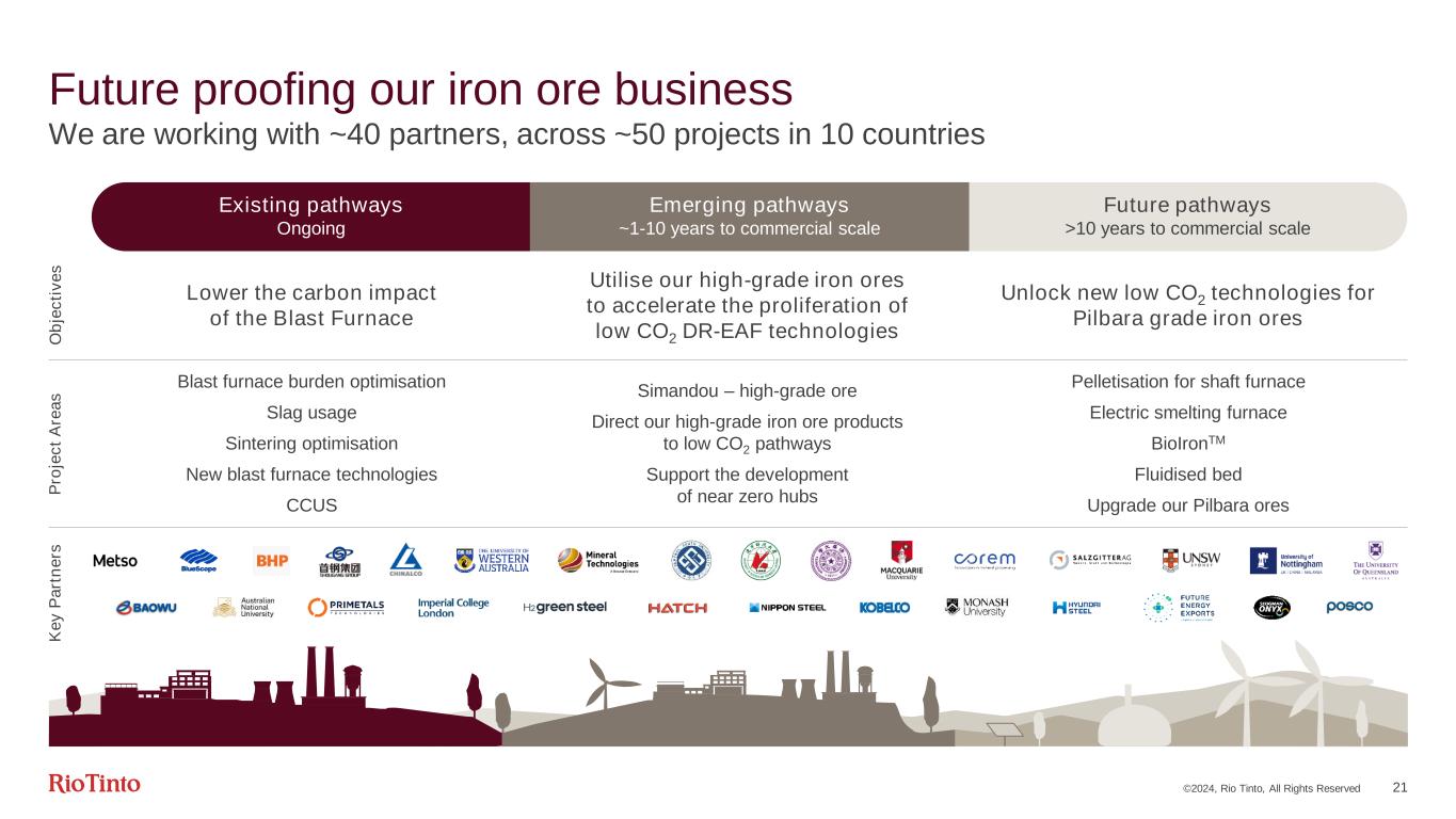 Applying renewables Reimagining manufacturing Circular economy ©2024, Rio Tinto, All Rights Reserved 20 Decarbonisation: from strategy to action • Two renewable power contracts signed: • Agreement with European Energy to drive development of Australia’s largest solar farm • Agreement with Windlab to buy the majority of electricity from the Bungabun wind farm • Full transition to renewable diesel at Boron achieved in 2023 • Kennecott to fully transition to renewable diesel starting in 2024 • Ilmenite reduction technology • Potential for 95% lower GHG emissions • Innovative technology developed by Rio Tinto • Joint venture with Matalco formed in December • Full suite of aluminium products including low-carbon primary aluminium, made with hydropower, and a diverse portfolio of recycled aluminum solutions • Continuing ELYSISTM development to move towards zero carbon aluminium smelting BlueSmeltingTM at Sorel-Tracy Launching into recycled aluminiumRe-powering our Gladstone assets Renewable diesel