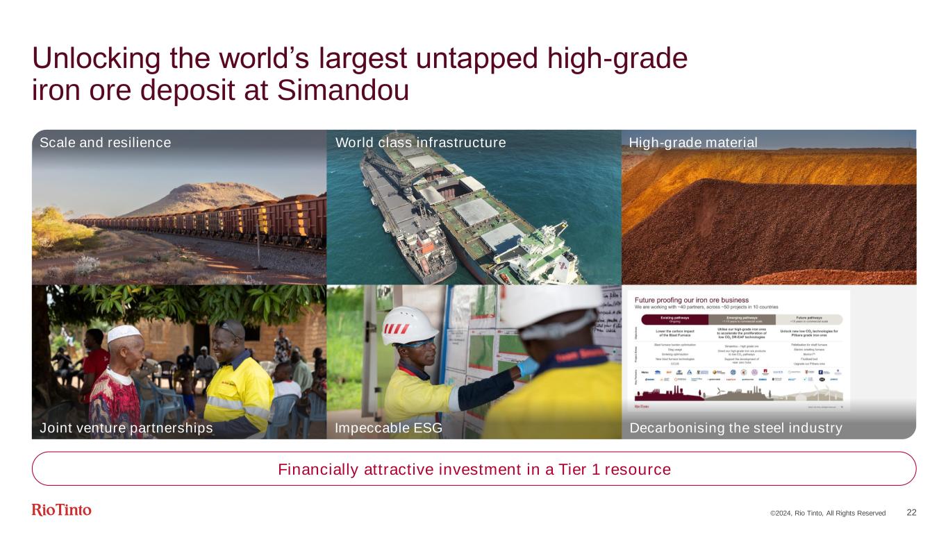 ©2024, Rio Tinto, All Rights Reserved 21 Future proofing our iron ore business We are working with ~40 partners, across ~50 projects in 10 countries Existing pathways Ongoing Emerging pathways ~1-10 years to commercial scale Future pathways >10 years to commercial scale O b je c ti v e s P ro je c t A re a s Lower the carbon impact of the Blast Furnace Utilise our high-grade iron ores to accelerate the proliferation of low CO2 DR-EAF technologies Unlock new low CO2 technologies for Pilbara grade iron ores Blast furnace burden optimisation Slag usage Sintering optimisation New blast furnace technologies CCUS Simandou – high-grade ore Direct our high-grade iron ore products to low CO2 pathways Support the development of near zero hubs Pelletisation for shaft furnace Electric smelting furnace BioIronTM Fluidised bed Upgrade our Pilbara ores K e y P a rt n e rs