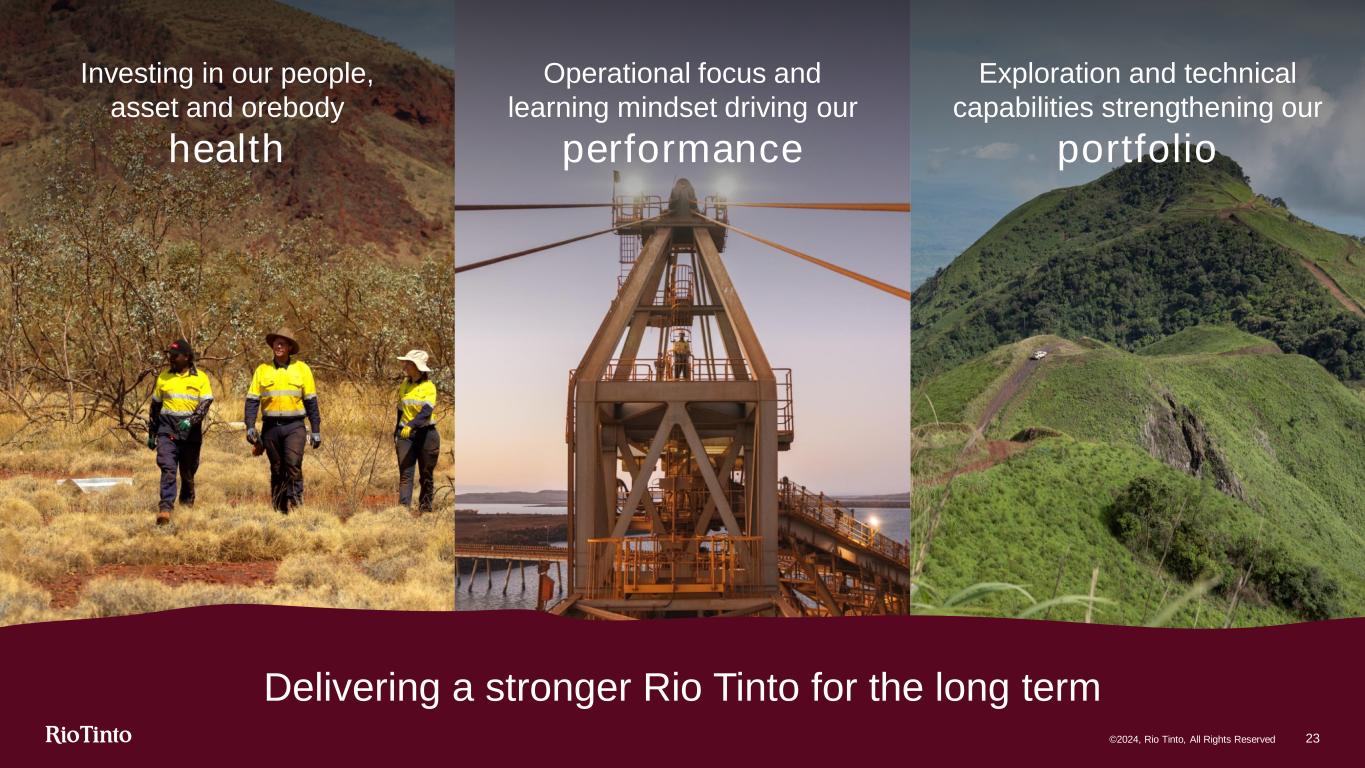 Exploration and technical capabilities strengthening our portfolio Operational focus and learning mindset driving our performance Investing in our people, asset and orebody health Delivering a stronger Rio Tinto for the long term ©2024, Rio Tinto, All Rights Reserved 23