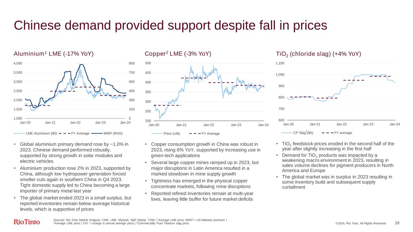 0 50 100 150 200 250 Jan-20 Jan-21 Jan-22 Jan-23 Jan-24 Iron ore (US$/dmt) FY Average ©2024, Rio Tinto, All Rights Reserved 27 Robust Chinese steel production absorbs record iron ore imports Iron ore1 (-0.5% YoY) $/dmt Seaborne Iron Ore supply run rate (Mt annualised2) • China’s crude steel production in 2023 was above 1Bt for the fourth consecutive year, with pig iron output up year-on-year • Resilient production was driven by a ~50% increase in China's net steel exports to 84Mt in 2023 • Finished steel consumption remained solid at ~0.9Bt. Domestic demand was supported by resilient infrastructure investment and manufacturing output, despite property market weakness • China's annual iron ore imports increased by 6.6% to hit a new record of 1.18Bt in 2023, driven by high domestic consumption and the redirection of shipments from other regions • Seaborne iron ore supply rose to ~1.5Bt in 2023, up 5% and 74Mt year-on-year. Higher cost producers accounted for the majority (55Mt) of the incremental supply, while the major iron ore producers contributed the remainder of the increase 1,200 1,250 1,300 1,350 1,400 1,450 1,500 1,550 1,600 1,650 1,700 Jan Feb Mar Apr May Jun Jul Aug Sep Oct Nov Dec 5 Yr Range 5 Yr Average 2022 2023 3 3 Sources: Rio Tinto Market Analysis, Kpler, S&P Global | 1Monthly average Platts (CFR) index for 62% iron fines. YoY = change in annual average price | 2Total seaborne suppliers annualised, reported at 100% | 35-year range and average based on 2018 to 2022