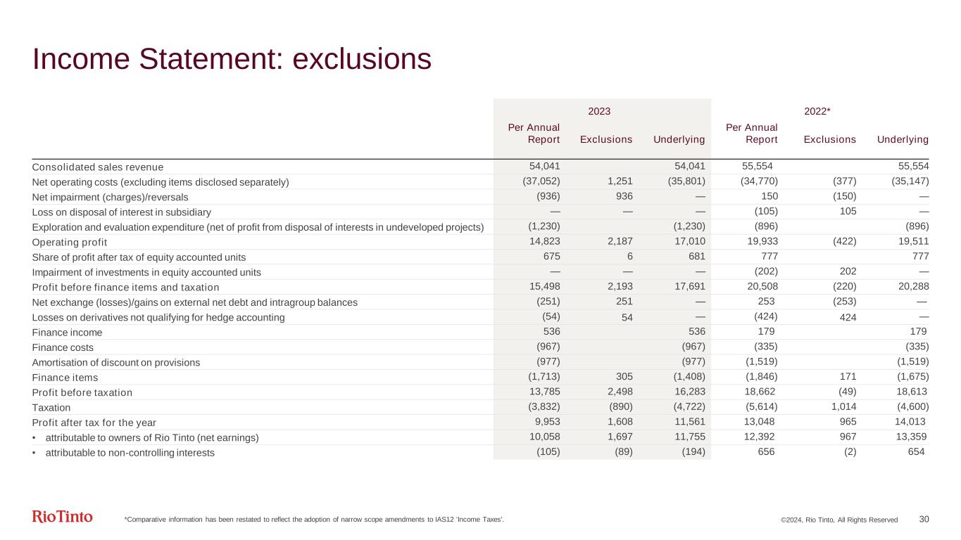©2024, Rio Tinto, All Rights Reserved 30 Income Statement: exclusions 2023 2022* Per Annual Report Exclusions Underlying Per Annual Report Exclusions Underlying Consolidated sales revenue 54,041 54,041 55,554 55,554 Net operating costs (excluding items disclosed separately) (37,052) 1,251 (35,801) (34,770) (377) (35,147) Net impairment (charges)/reversals (936) 936 — 150 (150) — Loss on disposal of interest in subsidiary — — — (105) 105 — Exploration and evaluation expenditure (net of profit from disposal of interests in undeveloped projects) (1,230) (1,230) (896) (896) Operating profit 14,823 2,187 17,010 19,933 (422) 19,511 Share of profit after tax of equity accounted units 675 6 681 777 777 Impairment of investments in equity accounted units — — — (202) 202 — Profit before finance items and taxation 15,498 2,193 17,691 20,508 (220) 20,288 Net exchange (losses)/gains on external net debt and intragroup balances (251) 251 — 253 (253) — Losses on derivatives not qualifying for hedge accounting (54) 54 — (424) 424 — Finance income 536 536 179 179 Finance costs (967) (967) (335) (335) Amortisation of discount on provisions (977) (977) (1,519) (1,519) Finance items (1,713) 305 (1,408) (1,846) 171 (1,675) Profit before taxation 13,785 2,498 16,283 18,662 (49) 18,613 Taxation (3,832) (890) (4,722) (5,614) 1,014 (4,600) Profit after tax for the year 9,953 1,608 11,561 13,048 965 14,013 • attributable to owners of Rio Tinto (net earnings) 10,058 1,697 11,755 12,392 967 13,359 • attributable to non-controlling interests (105) (89) (194) 656 (2) 654 *Comparative information has been restated to reflect the adoption of narrow scope amendments to IAS12 'Income Taxes'.