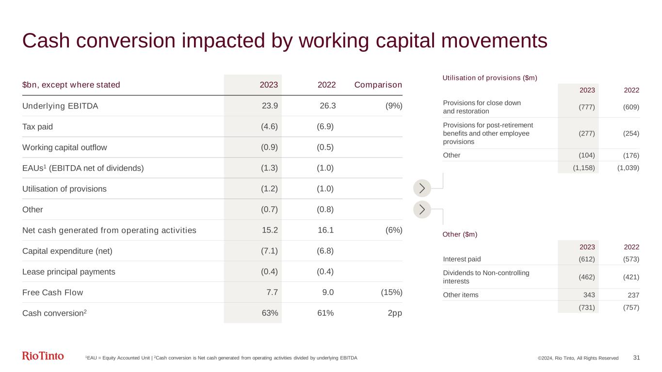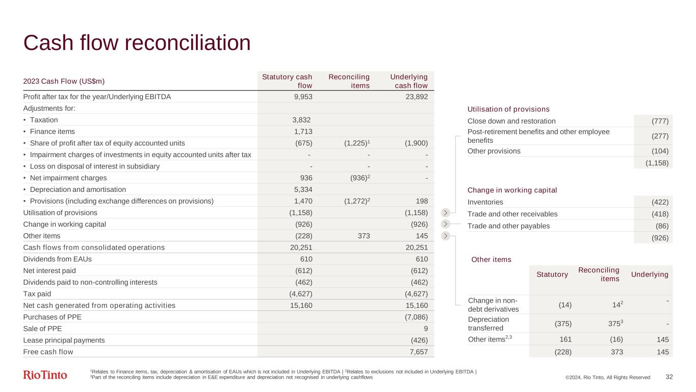 ©2024, Rio Tinto, All Rights Reserved 31 Cash conversion impacted by working capital movements 1EAU = Equity Accounted Unit | 2Cash conversion is Net cash generated from operating activities divided by underlying EBITDA Other ($m) 2023 2022 Interest paid (612) (573) Dividends to Non-controlling interests (462) (421) Other items 343 237 (731) (757) $bn, except where stated 2023 2022 Comparison Underlying EBITDA 23.9 26.3 (9%) Tax paid (4.6) (6.9) Working capital outflow (0.9) (0.5) EAUs1 (EBITDA net of dividends) (1.3) (1.0) Utilisation of provisions (1.2) (1.0) Other (0.7) (0.8) Net cash generated from operating activities 15.2 16.1 (6%) Capital expenditure (net) (7.1) (6.8) Lease principal payments (0.4) (0.4) Free Cash Flow 7.7 9.0 (15%) Cash conversion2 63% 61% 2pp Utilisation of provisions ($m) 2023 2022 Provisions for close down and restoration (777) (609) Provisions for post-retirement benefits and other employee provisions (277) (254) Other (104) (176) (1,158) (1,039)
