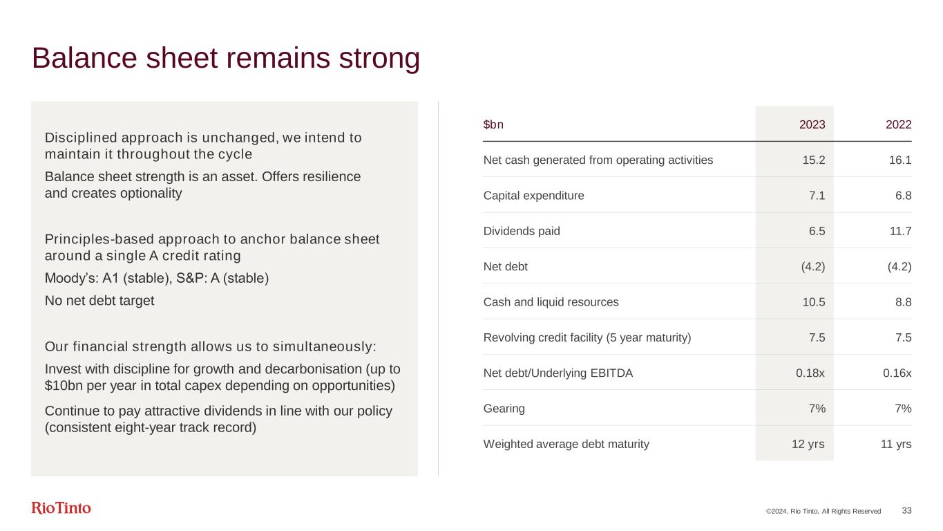 ©2024, Rio Tinto, All Rights Reserved 32 Cash flow reconciliation 2023 Cash Flow (US$m) Statutory cash flow Reconciling items Underlying cash flow Profit after tax for the year/Underlying EBITDA 9,953 23,892 Adjustments for: • Taxation 3,832 • Finance items 1,713 • Share of profit after tax of equity accounted units (675) (1,225)1 (1,900) • Impairment charges of investments in equity accounted units after tax - - - • Loss on disposal of interest in subsidiary - - - • Net impairment charges 936 (936)2 - • Depreciation and amortisation 5,334 • Provisions (including exchange differences on provisions) 1,470 (1,272)2 198 Utilisation of provisions (1,158) (1,158) Change in working capital (926) (926) Other items (228) 373 145 Cash flows from consolidated operations 20,251 20,251 Dividends from EAUs 610 610 Net interest paid (612) (612) Dividends paid to non-controlling interests (462) (462) Tax paid (4,627) (4,627) Net cash generated from operating activities 15,160 15,160 Purchases of PPE (7,086) Sale of PPE 9 Lease principal payments (426) Free cash flow 7,657 Other items Statutory Reconciling items Underlying Change in non- debt derivatives (14) 142 - Depreciation transferred (375) 3753 - Other items2,3 161 (16) 145 (228) 373 145 Utilisation of provisions Close down and restoration (777) Post-retirement benefits and other employee benefits (277) Other provisions (104) (1,158) Change in working capital Inventories (422) Trade and other receivables (418) Trade and other payables (86) (926) 1Relates to Finance items, tax, depreciation & amortisation of EAUs which is not included in Underlying EBITDA | 2Relates to exclusions not included in Underlying EBITDA | 3Part of the reconciling items include depreciation in E&E expenditure and depreciation not recognised in underlying cashflows