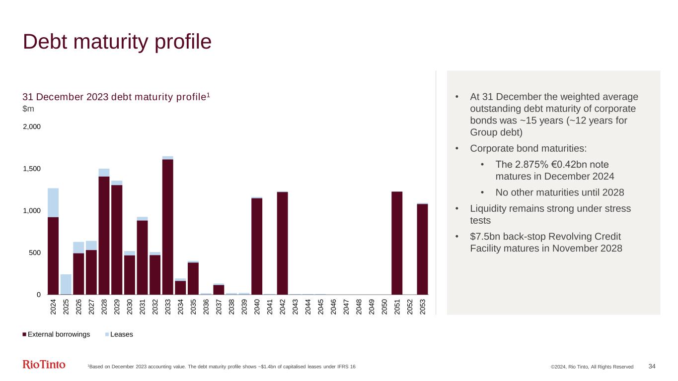 Disciplined approach is unchanged, we intend to maintain it throughout the cycle Balance sheet strength is an asset. Offers resilience and creates optionality Principles-based approach to anchor balance sheet around a single A credit rating Moody’s: A1 (stable), S&P: A (stable) No net debt target Our financial strength allows us to simultaneously: Invest with discipline for growth and decarbonisation (up to $10bn per year in total capex depending on opportunities) Continue to pay attractive dividends in line with our policy (consistent eight-year track record) ©2024, Rio Tinto, All Rights Reserved 33 Balance sheet remains strong $bn 2023 2022 Net cash generated from operating activities 15.2 16.1 Capital expenditure 7.1 6.8 Dividends paid 6.5 11.7 Net debt (4.2) (4.2) Cash and liquid resources 10.5 8.8 Revolving credit facility (5 year maturity) 7.5 7.5 Net debt/Underlying EBITDA 0.18x 0.16x Gearing 7% 7% Weighted average debt maturity 12 yrs 11 yrs