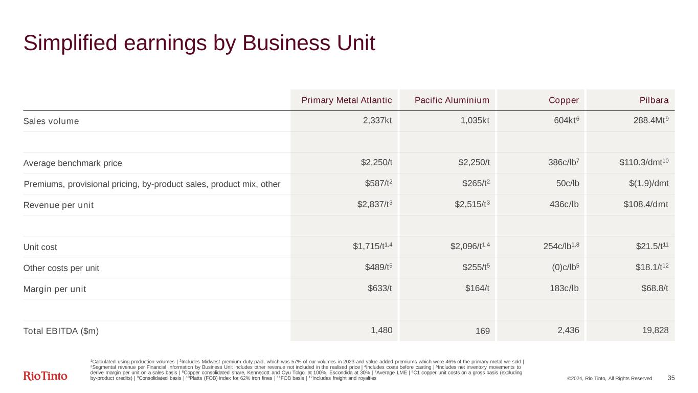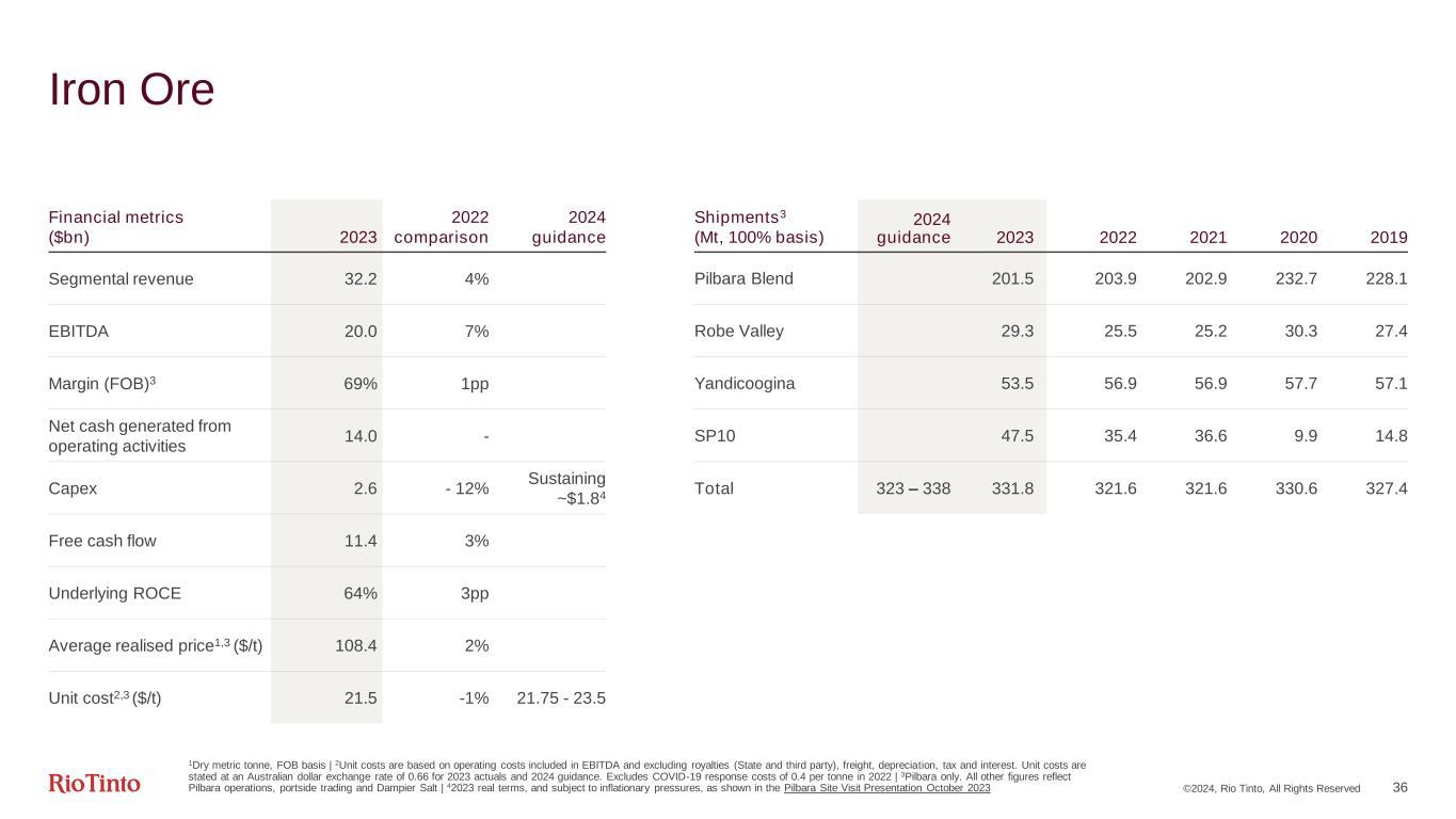 ©2024, Rio Tinto, All Rights Reserved 35 Simplified earnings by Business Unit Primary Metal Atlantic Pacific Aluminium Copper Pilbara Sales volume 2,337kt 1,035kt 604kt6 288.4Mt9 Average benchmark price $2,250/t $2,250/t 386c/lb7 $110.3/dmt10 Premiums, provisional pricing, by-product sales, product mix, other $587/t2 $265/t2 50c/lb $(1.9)/dmt Revenue per unit $2,837/t3 $2,515/t3 436c/lb $108.4/dmt Unit cost $1,715/t1,4 $2,096/t1,4 254c/lb1,8 $21.5/t11 Other costs per unit $489/t5 $255/t5 (0)c/lb5 $18.1/t12 Margin per unit $633/t $164/t 183c/lb $68.8/t Total EBITDA ($m) 1,480 169 2,436 19,828 1Calculated using production volumes | 2Includes Midwest premium duty paid, which was 57% of our volumes in 2023 and value added premiums which were 46% of the primary metal we sold | 3Segmental revenue per Financial Information by Business Unit includes other revenue not included in the realised price | 4Includes costs before casting | 5Includes net inventory movements to derive margin per unit on a sales basis | 6Copper consolidated share, Kennecott and Oyu Tolgoi at 100%, Escondida at 30% | 7Average LME | 8C1 copper unit costs on a gross basis (excluding by-product credits) | 9Consolidated basis | 10Platts (FOB) index for 62% iron fines | 11FOB basis | 12Includes freight and royalties