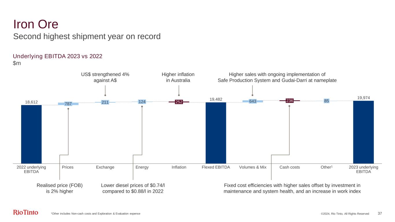 ©2024, Rio Tinto, All Rights Reserved 36 Iron Ore Financial metrics ($bn) 2023 2022 comparison 2024 guidance Segmental revenue 32.2 4% EBITDA 20.0 7% Margin (FOB)3 69% 1pp Net cash generated from operating activities 14.0 - Capex 2.6 - 12% Sustaining ~$1.84 Free cash flow 11.4 3% Underlying ROCE 64% 3pp Average realised price1,3 ($/t) 108.4 2% Unit cost2,3 ($/t) 21.5 -1% 21.75 - 23.5 Shipments3 (Mt, 100% basis) 2024 guidance 2023 2022 2021 2020 2019 Pilbara Blend 201.5 203.9 202.9 232.7 228.1 Robe Valley 29.3 25.5 25.2 30.3 27.4 Yandicoogina 53.5 56.9 56.9 57.7 57.1 SP10 47.5 35.4 36.6 9.9 14.8 Total 323 – 338 331.8 321.6 321.6 330.6 327.4 1Dry metric tonne, FOB basis | 2Unit costs are based on operating costs included in EBITDA and excluding royalties (State and third party), freight, depreciation, tax and interest. Unit costs are stated at an Australian dollar exchange rate of 0.66 for 2023 actuals and 2024 guidance. Excludes COVID-19 response costs of 0.4 per tonne in 2022 | 3Pilbara only. All other figures reflect Pilbara operations, portside trading and Dampier Salt | 42023 real terms, and subject to inflationary pressures, as shown in the Pilbara Site Visit Presentation October 2023