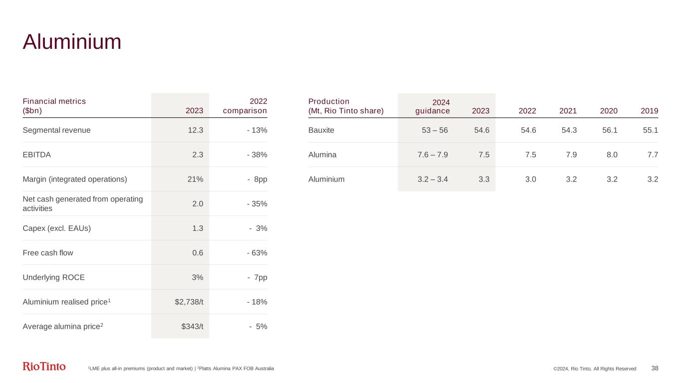 ©2024, Rio Tinto, All Rights Reserved 37 Iron Ore Second highest shipment year on record Underlying EBITDA 2023 vs 2022 $m Higher sales with ongoing implementation of Safe Production System and Gudai-Darri at nameplate Lower diesel prices of $0.74/l compared to $0.88/l in 2022 Realised price (FOB) is 2% higher US$ strengthened 4% against A$ 18,612 19,482 19,974 2022 underlying EBITDA 787 Prices 211 Exchange 124 Energy 252 Inflation Flexed EBITDA 643 Volumes & Mix 236 Cash costs 85 Other1 2023 underlying EBITDA Higher inflation in Australia Fixed cost efficiencies with higher sales offset by investment in maintenance and system health, and an increase in work index 1Other includes Non-cash costs and Exploration & Evaluation expense
