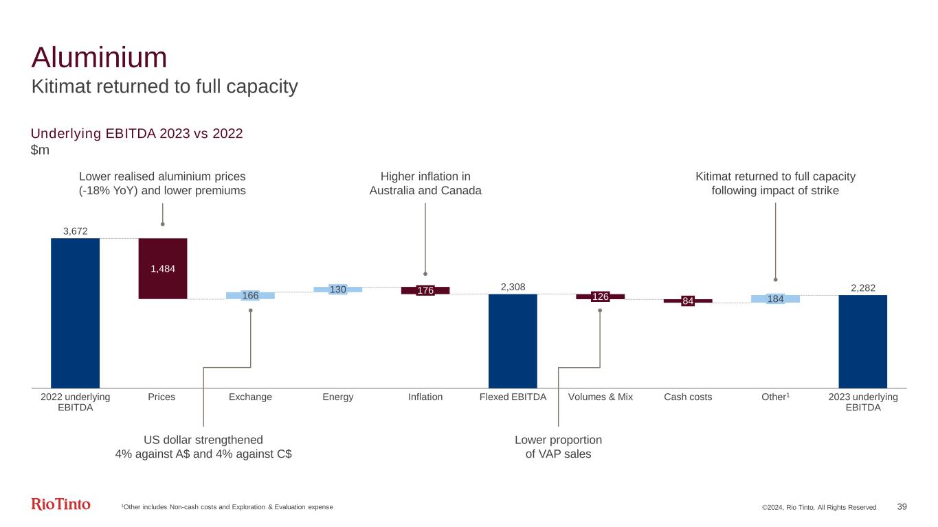©2024, Rio Tinto, All Rights Reserved 38 Aluminium Financial metrics ($bn) 2023 2022 comparison Segmental revenue 12.3 - 13% EBITDA 2.3 - 38% Margin (integrated operations) 21% - 8pp Net cash generated from operating activities 2.0 - 35% Capex (excl. EAUs) 1.3 - 3% Free cash flow 0.6 - 63% Underlying ROCE 3% - 7pp Aluminium realised price1 $2,738/t - 18% Average alumina price2 $343/t - 5% Production (Mt, Rio Tinto share) 2024 guidance 2023 2022 2021 2020 2019 Bauxite 53 – 56 54.6 54.6 54.3 56.1 55.1 Alumina 7.6 – 7.9 7.5 7.5 7.9 8.0 7.7 Aluminium 3.2 – 3.4 3.3 3.0 3.2 3.2 3.2 1LME plus all-in premiums (product and market) | 2Platts Alumina PAX FOB Australia