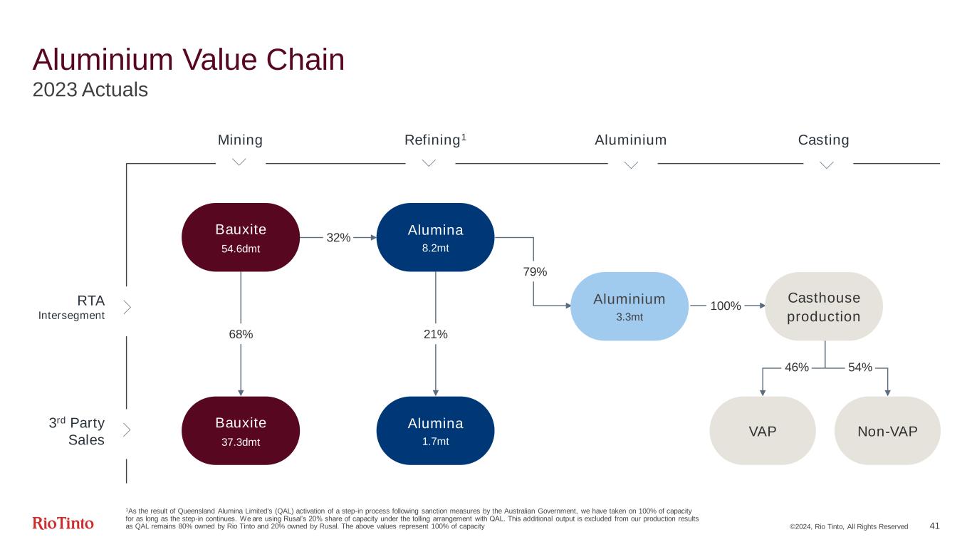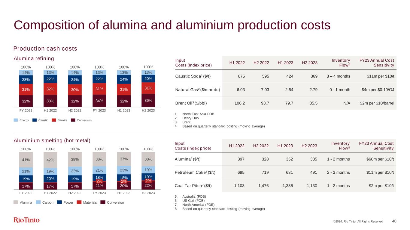 ©2024, Rio Tinto, All Rights Reserved 40 Composition of alumina and aluminium production costs Alumina refining Production cash costs Aluminium smelting (hot metal) Input Costs (Index price) H1 2022 H2 2022 H1 2023 H2 2023 Inventory Flow4 FY23 Annual Cost Sensitivity Caustic Soda1 ($/t) 675 595 424 369 3 – 4 months $11m per $10/t Natural Gas2 ($/mmbtu) 6.03 7.03 2.54 2.79 0 - 1 month $4m per $0.10/GJ Brent Oil3 ($/bbl) 106.2 93.7 79.7 85.5 N/A $2m per $10/barrel Input Costs (Index price) H1 2022 H2 2022 H1 2023 H2 2023 Inventory Flow8 FY23 Annual Cost Sensitivity Alumina5 ($/t) 397 328 352 335 1 - 2 months $60m per $10/t Petroleum Coke6 ($/t) 695 719 631 491 2 - 3 months $11m per $10/t Coal Tar Pitch7 ($/t) 1,103 1,476 1,386 1,130 1 - 2 months $2m per $10/t 5. Australia (FOB) 6. US Gulf (FOB) 7. North America (FOB) 8. Based on quarterly standard costing (moving average) 1. North East Asia FOB 2. Henry Hub 3. Brent 4. Based on quarterly standard costing (moving average) 32% 33% 32% 34% 32% 36% 31% 32% 30% 31% 31% 31% 23% 22% 24% 22% 24% 20% 14% 13% 14% 13% 13% 13% FY 2022 H1 2022 H2 2022 FY 2023 H1 2023 H2 2023 100% 100% 100% 100% 100% 100% Energy Caustic Bauxite Conversion 17% 17% 17% 21% 20% 22% 2% 2% 2% 19% 20% 19% 18% 18% 19% 21% 19% 23% 21% 23% 19% 41% 42% 39% 38% 37% 38% FY 2022 H1 2022 H2 2022 2% FY 2023 2% H1 2023 2% H2 2023 100% 100% 100% 100% 100% 100% Alumina Carbon Power Materials Conversion