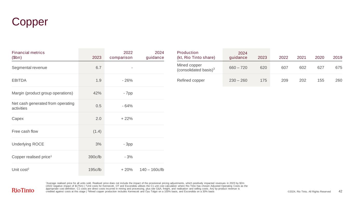 100% ©2024, Rio Tinto, All Rights Reserved 41 Aluminium Value Chain 2023 Actuals Mining Aluminium Casting Bauxite 37.3dmt Bauxite 54.6dmt Refining1 Alumina 8.2mt Alumina 1.7mt VAP Non-VAP Aluminium 3.3mt Casthouse production 32% 79% 68% 21% 46% 54% RTA Intersegment 3rd Party Sales 1As the result of Queensland Alumina Limited's (QAL) activation of a step-in process following sanction measures by the Australian Government, we have taken on 100% of capacity for as long as the step-in continues. We are using Rusal’s 20% share of capacity under the tolling arrangement with QAL. This additional output is excluded from our production results as QAL remains 80% owned by Rio Tinto and 20% owned by Rusal. The above values represent 100% of capacity