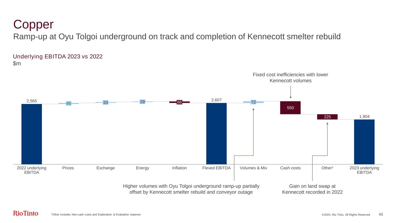 ©2024, Rio Tinto, All Rights Reserved 42 Copper 1Average realised price for all units sold. Realised price does not include the impact of the provisional pricing adjustments, which positively impacted revenues in 2023 by $2m (2022 negative impact of $175m) | 2Unit costs for Kennecott, OT and Escondida utilises the C1 unit cost calculation where Rio Tinto has chosen Adjusted Operating Costs as the appropriate cost definition. C1 costs are direct costs incurred in mining and processing, plus site G&A, freight, and realisation and selling costs. Any by-product revenue is credited against costs at this stage | 3Mined copper production includes Kennecott and Oyu Tolgoi on a 100% basis, and Escondida on a 30% basis Financial metrics ($bn) 2023 2022 comparison 2024 guidance Segmental revenue 6.7 - EBITDA 1.9 - 26% Margin (product group operations) 42% - 7pp Net cash generated from operating activities 0.5 - 64% Capex 2.0 + 22% Free cash flow (1.4) Underlying ROCE 3% - 3pp Copper realised price1 390c/lb - 3% Unit cost2 195c/lb + 20% 140 – 160c/lb Production (kt, Rio Tinto share) 2024 guidance 2023 2022 2021 2020 2019 Mined copper (consolidated basis)3 660 – 720 620 607 602 627 675 Refined copper 230 – 260 175 209 202 155 260