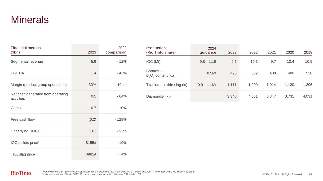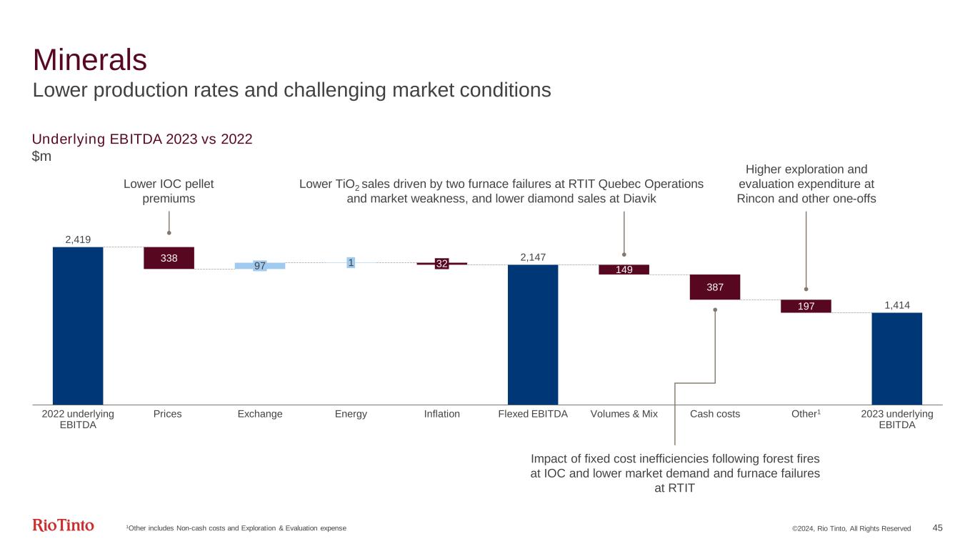 1Wet metric tonne | 2TZMI chloride slag assessment in December 2023, excludes UGS | 3Diavik only. On 17 November 2021, Rio Tinto’s interest in Diavik increased from 60% to 100%. Production and financials reflect this from 1 November 2021 ©2024, Rio Tinto, All Rights Reserved 44 Minerals Financial metrics ($bn) 2023 2022 comparison Segmental revenue 5.9 - 12% EBITDA 1.4 - 42% Margin (product group operations) 30% - 10 pp Net cash generated from operating activities 0.5 - 64% Capex 0.7 + 10% Free cash flow (0.2) - 128% Underlying ROCE 13% - 9 pp IOC pellets price1 $155/t - 19% TiO2 slag price2 $985/t + 4% Production (Rio Tinto share) 2024 guidance 2023 2022 2021 2020 2019 IOC (Mt) 9.8 – 11.5 9.7 10.3 9.7 10.4 10.5 Borates – B2O3 content (kt) ~0.5Mt 495 532 488 480 520 Titanium dioxide slag (kt) 0.9 – 1.1Mt 1,111 1,200 1,014 1,120 1,206 Diamonds3 (kt) 3,340 4,651 3,847 3,731 4,031