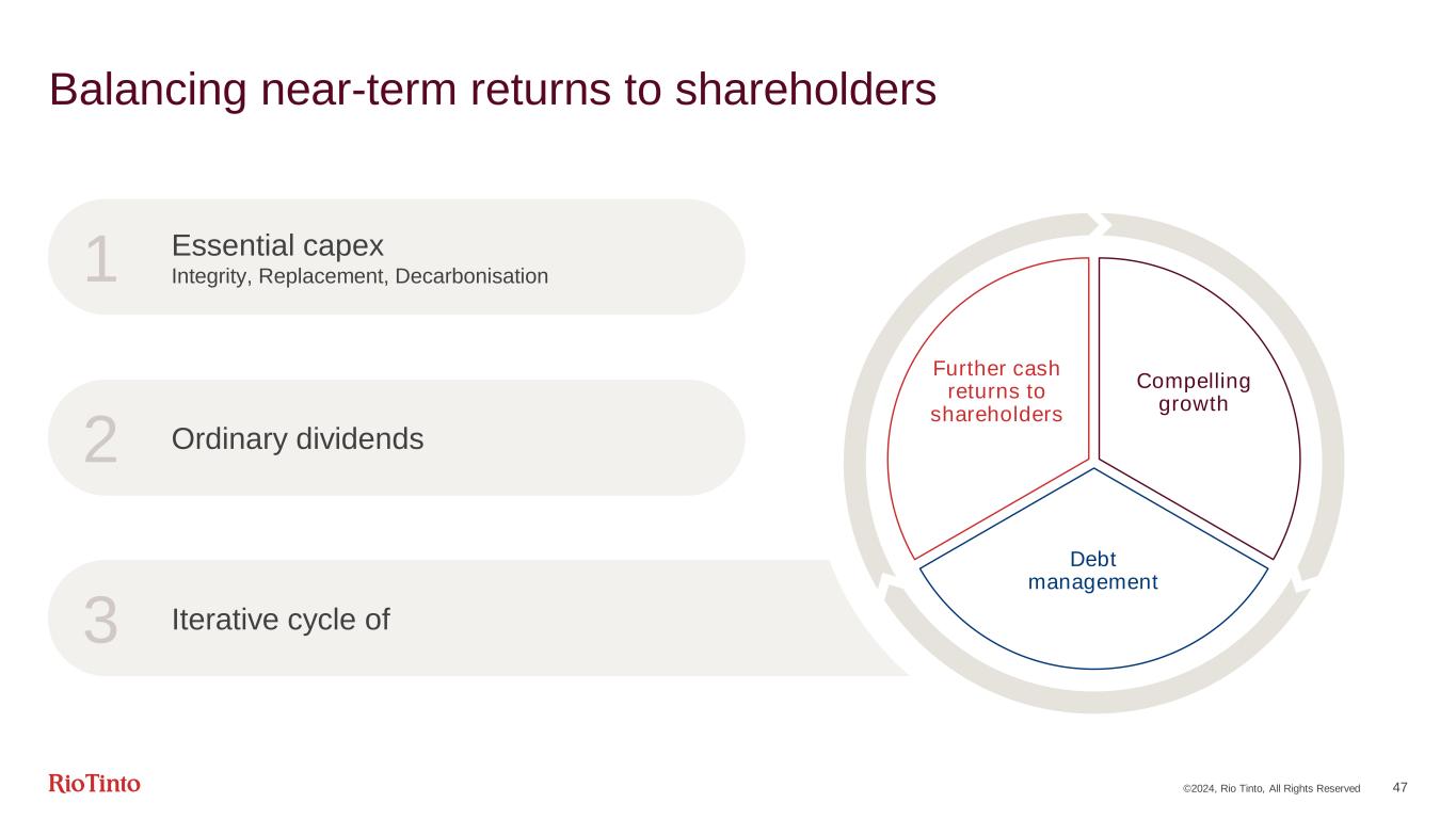 ©2024, Rio Tinto, All Rights Reserved 47 Balancing near-term returns to shareholders Essential capex Integrity, Replacement, Decarbonisation1 Ordinary dividends2 Iterative cycle of3 Further cash returns to shareholders Compelling growth Debt management
