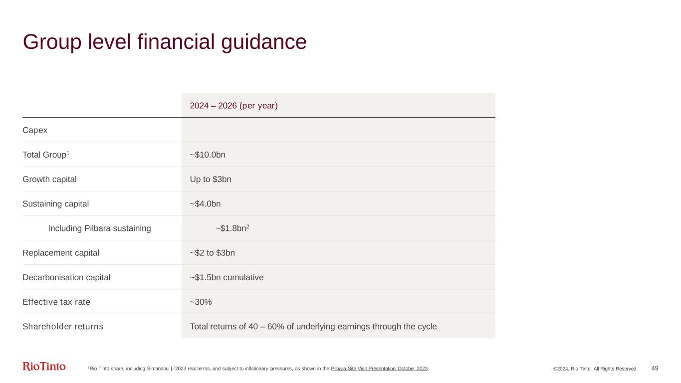 ©2024, Rio Tinto, All Rights Reserved 48 Product group level guidance 1Pilbara shipments guidance remains subject to weather, market conditions and management of cultural heritage | 2Includes Oyu Tolgoi on a 100% consolidated basis and continues to reflect our 30% share of Escondida | 3Iron Ore Company of Canada | 4FY23 guidance is based on A$:US$ exchange rate of 0.66 2024 Guidance Pilbara iron ore shipments1 (100% basis) 323 – 338Mt Copper Mined Copper (consolidated basis)2 Refined Copper 660 – 720kt 230 – 260kt Aluminium Bauxite Alumina Aluminium 53 – 56Mt 7.6 – 7.9Mt 3.2 – 3.4Mt Minerals TiO2 IOC3 pellets and concentrate B2O3 0.9 – 1.1Mt 9.8 – 11.5Mt ~0.5Mt 2024 Unit cost guidance Pilbara Iron Ore ($/tonne)4 $21.75 – $23.5 Copper C1 (US cents/lb) 140 – 160