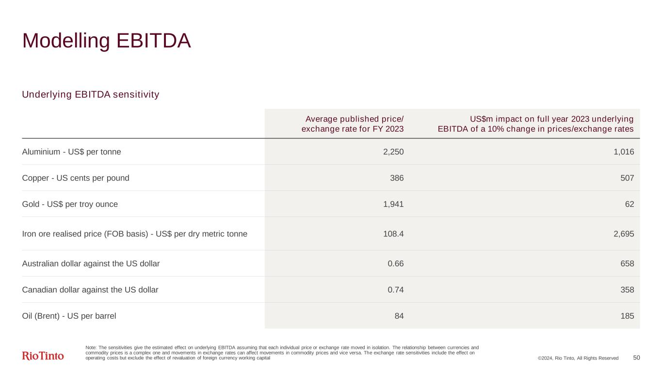 ©2024, Rio Tinto, All Rights Reserved 50 Modelling EBITDA Average published price/ exchange rate for FY 2023 US$m impact on full year 2023 underlying EBITDA of a 10% change in prices/exchange rates Aluminium - US$ per tonne 2,250 1,016 Copper - US cents per pound 386 507 Gold - US$ per troy ounce 1,941 62 Iron ore realised price (FOB basis) - US$ per dry metric tonne 108.4 2,695 Australian dollar against the US dollar 0.66 658 Canadian dollar against the US dollar 0.74 358 Oil (Brent) - US per barrel 84 185 Note: The sensitivities give the estimated effect on underlying EBITDA assuming that each individual price or exchange rate moved in isolation. The relationship between currencies and commodity prices is a complex one and movements in exchange rates can affect movements in commodity prices and vice versa. The exchange rate sensitivities include the effect on operating costs but exclude the effect of revaluation of foreign currency working capital Underlying EBITDA sensitivity