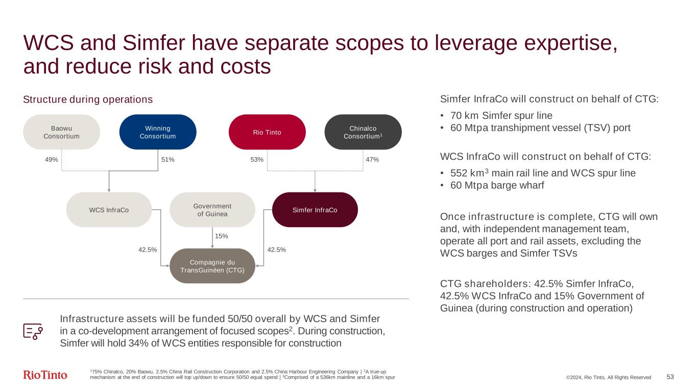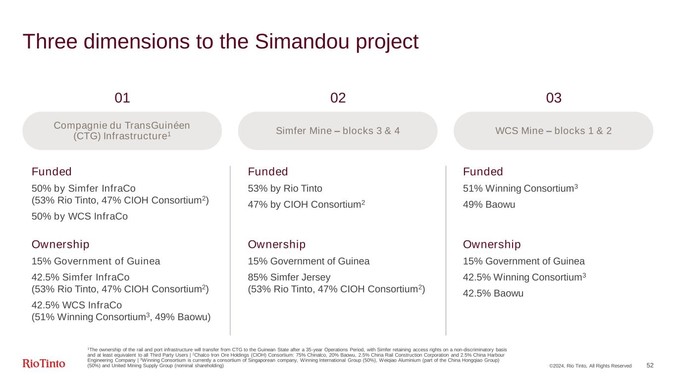©2024, Rio Tinto, All Rights Reserved Three dimensions to the Simandou project Funded 50% by Simfer InfraCo (53% Rio Tinto, 47% CIOH Consortium2) 50% by WCS InfraCo Funded 51% Winning Consortium3 49% Baowu 1The ownership of the rail and port infrastructure will transfer from CTG to the Guinean State after a 35-year Operations Period, with Simfer retaining access rights on a non-discriminatory basis and at least equivalent to all Third Party Users | 2Chalco Iron Ore Holdings (CIOH) Consortium: 75% Chinalco, 20% Baowu, 2.5% China Rail Construction Corporation and 2.5% China Harbour Engineering Company | 3Winning Consortium is currently a consortium of Singaporean company, Winning International Group (50%), Weiqiao Aluminium (part of the China Hongqiao Group) (50%) and United Mining Supply Group (nominal shareholding) Funded 53% by Rio Tinto 47% by CIOH Consortium2 Compagnie du TransGuinéen (CTG) Infrastructure1 Simfer Mine – blocks 3 & 4 WCS Mine – blocks 1 & 2 01 02 03 Ownership 15% Government of Guinea 42.5% Simfer InfraCo (53% Rio Tinto, 47% CIOH Consortium2) 42.5% WCS InfraCo (51% Winning Consortium3, 49% Baowu) Ownership 15% Government of Guinea 42.5% Winning Consortium3 42.5% Baowu Ownership 15% Government of Guinea 85% Simfer Jersey (53% Rio Tinto, 47% CIOH Consortium2) 52