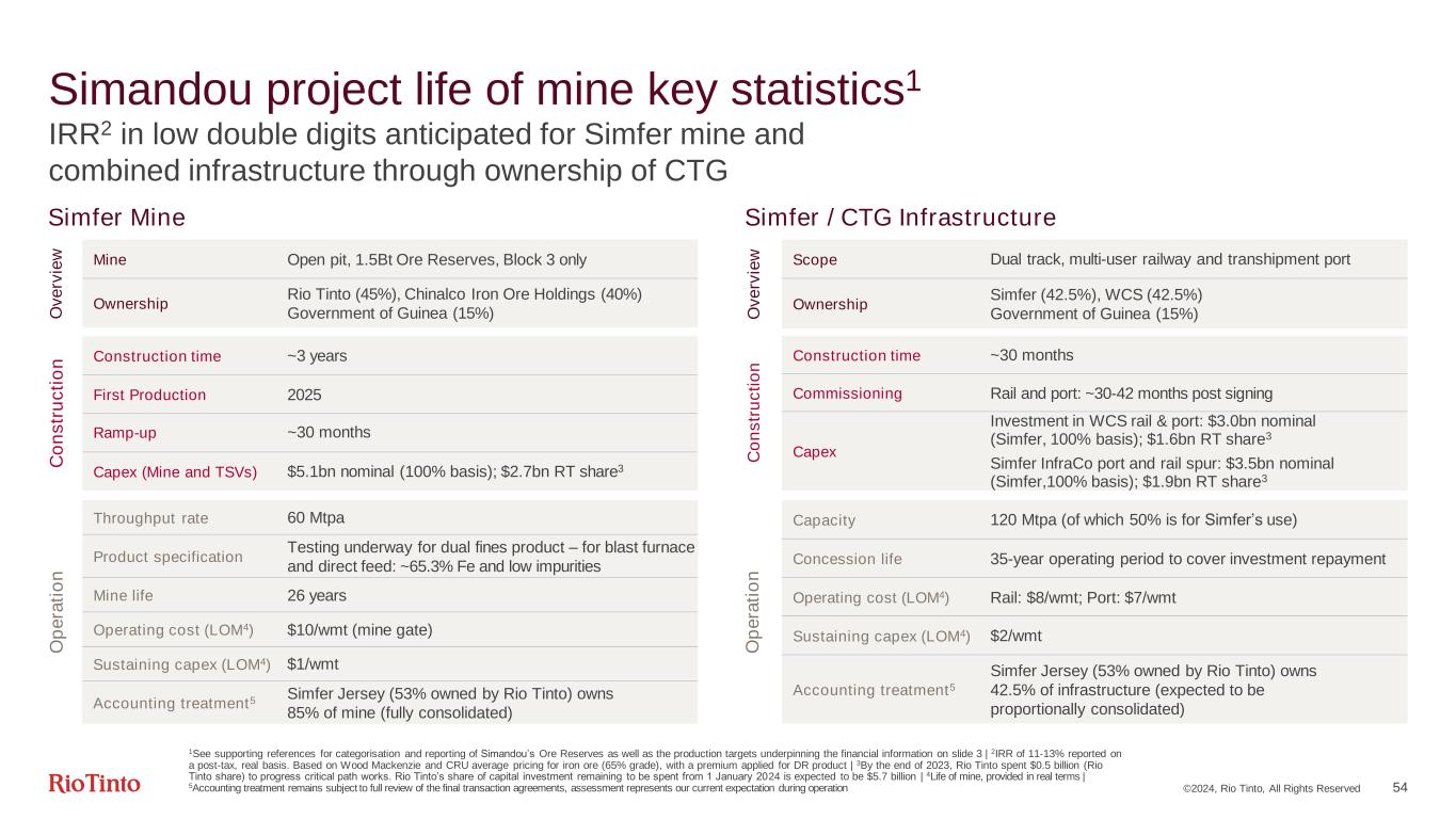 Simfer InfraCo will construct on behalf of CTG: • 70 km Simfer spur line • 60 Mtpa transhipment vessel (TSV) port WCS InfraCo will construct on behalf of CTG: • 552 km3 main rail line and WCS spur line • 60 Mtpa barge wharf Once infrastructure is complete, CTG will own and, with independent management team, operate all port and rail assets, excluding the WCS barges and Simfer TSVs CTG shareholders: 42.5% Simfer InfraCo, 42.5% WCS InfraCo and 15% Government of Guinea (during construction and operation) ©2024, Rio Tinto, All Rights Reserved 53 WCS and Simfer have separate scopes to leverage expertise, and reduce risk and costs Structure during operations Infrastructure assets will be funded 50/50 overall by WCS and Simfer in a co-development arrangement of focused scopes2. During construction, Simfer will hold 34% of WCS entities responsible for construction 175% Chinalco, 20% Baowu, 2.5% China Rail Construction Corporation and 2.5% China Harbour Engineering Company | 2A true-up mechanism at the end of construction will top up/down to ensure 50/50 equal spend | 3Comprised of a 536km mainline and a 16km spur 15% Baowu Consortium Winning Consortium WCS InfraCo Government of Guinea Compagnie du TransGuinéen (CTG) Rio Tinto Chinalco Consortium1 Simfer InfraCo 51%49% 42.5% 42.5% 47%53%