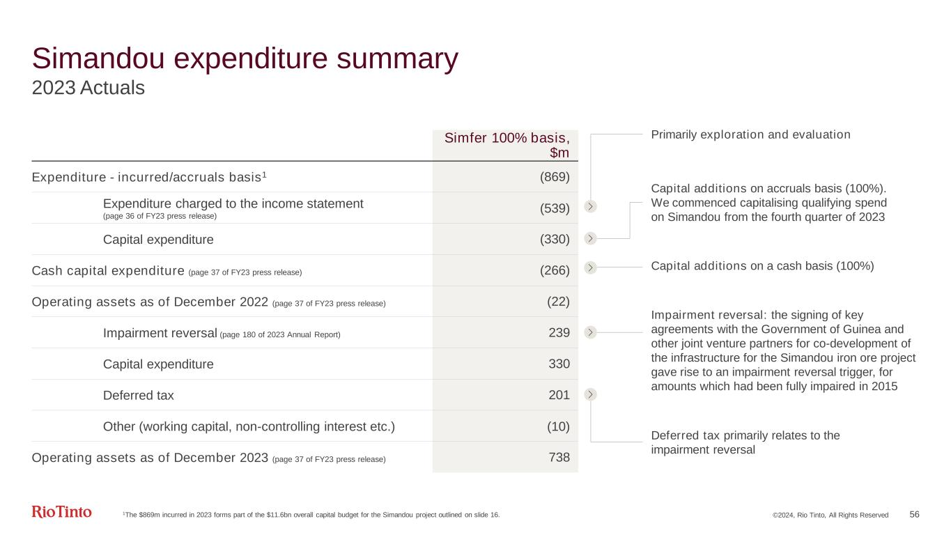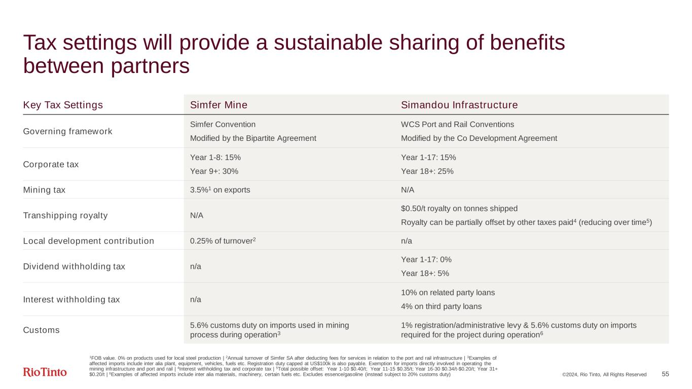 ©2024, Rio Tinto, All Rights Reserved 55 Tax settings will provide a sustainable sharing of benefits between partners Key Tax Settings Simfer Mine Simandou Infrastructure Governing framework Simfer Convention Modified by the Bipartite Agreement WCS Port and Rail Conventions Modified by the Co Development Agreement Corporate tax Year 1-8: 15% Year 9+: 30% Year 1-17: 15% Year 18+: 25% Mining tax 3.5%1 on exports N/A Transhipping royalty N/A $0.50/t royalty on tonnes shipped Royalty can be partially offset by other taxes paid4 (reducing over time5) Local development contribution 0.25% of turnover2 n/a Dividend withholding tax n/a Year 1-17: 0% Year 18+: 5% Interest withholding tax n/a 10% on related party loans 4% on third party loans Customs 5.6% customs duty on imports used in mining process during operation3 1% registration/administrative levy & 5.6% customs duty on imports required for the project during operation6 1FOB value. 0% on products used for local steel production | 2Annual turnover of Simfer SA after deducting fees for services in relation to the port and rail infrastructure | 3Examples of affected imports include inter alia plant, equipment, vehicles, fuels etc. Registration duty capped at US$100k is also payable. Exemption for imports directly involved in operating the mining infrastructure and port and rail | 4Interest withholding tax and corporate tax | 5Total possible offset: Year 1-10 $0.40/t; Year 11-15 $0.35/t; Year 16-30 $0.34/t-$0.20/t; Year 31+ $0.20/t | 6Examples of affected imports include inter alia materials, machinery, certain fuels etc. Excludes essence/gasoline (instead subject to 20% customs duty)