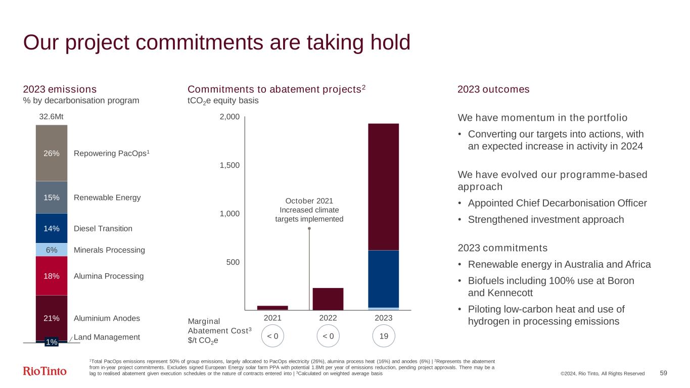©2024, Rio Tinto, All Rights Reserved 58 Our emissions differ from our peers ~80% arise from processing metals and minerals 2023 Scope 1 & 2 emissions 32.6Mt CO2e 2022: 32.7Mt CO2e (adjusted for acquisitions) Aluminium Anodes Repowering PacOps Alumina Processing Minerals Processing On-grid processing (Iceland, South Africa, Oman) Off-grid mining sites Renewable Energy Pilbara Other Diesel Transition L a n d m a n a g e m e n t 26% 8.4Mt CO2e 15% 4.8Mt CO2e 21% 6.8Mt CO2e 18% 5.8Mt CO2e 14% 4.5Mt CO2e 6% 2.0Mt CO2e 1% 0.3Mt CO2e Processing Mining, bulk Other