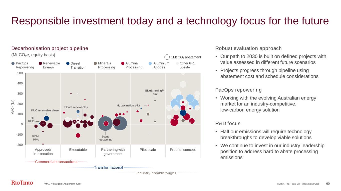 ©2024, Rio Tinto, All Rights Reserved 59 Our project commitments are taking hold Commitments to abatement projects2 tCO2e equity basis Marginal Abatement Cost3 $/t CO2e 19< 0< 0 500 1,000 1,500 2,000 2021 2022 2023 26% 15% 14% 6% 18% 21% 1% Repowering PacOps1 Renewable Energy Diesel Transition Minerals Processing Alumina Processing Aluminium Anodes Land Management 2023 emissions % by decarbonisation program 2023 outcomes October 2021 Increased climate targets implemented 32.6Mt 1Total PacOps emissions represent 50% of group emissions, largely allocated to PacOps electricity (26%), alumina process heat (16%) and anodes (6%) | 2Represents the abatement from in-year project commitments. Excludes signed European Energy solar farm PPA with potential 1.8Mt per year of emissions reduction, pending project approvals. There may be a lag to realised abatement given execution schedules or the nature of contracts entered into | 3Calculated on weighted average basis We have momentum in the portfolio • Converting our targets into actions, with an expected increase in activity in 2024 We have evolved our programme-based approach • Appointed Chief Decarbonisation Officer • Strengthened investment approach 2023 commitments • Renewable energy in Australia and Africa • Biofuels including 100% use at Boron and Kennecott • Piloting low-carbon heat and use of hydrogen in processing emissions