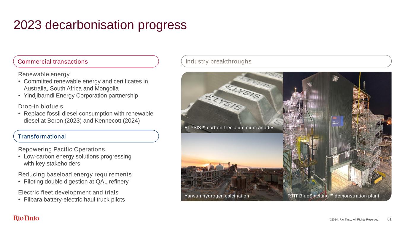 ©2024, Rio Tinto, All Rights Reserved 60 Responsible investment today and a technology focus for the future Decarbonisation project pipeline (Mt CO2e, equity basis) Approved/ in-execution Executable Pilot scalePartnering with government Proof of concept -200 -100 0 100 200 300 400 500 M A C 1 ( $ /t ) RBM PPA BlueSmelting™ pilot OT RECs 1Mt CO2 abatement Boyne repowering Commercial transactions Transformational Industry breakthroughs Pilbara renewables H2 calcination pilot Renewable Energy Diesel Transition Minerals Processing Alumina Processing PacOps Repowering Aluminium Anodes Other 6+1 upside KUC renewable diesel Robust evaluation approach • Our path to 2030 is built on defined projects with value assessed in different future scenarios • Projects progress through pipeline using abatement cost and schedule considerations PacOps repowering • Working with the evolving Australian energy market for an industry-competitive, low-carbon energy solution R&D focus • Half our emissions will require technology breakthroughs to develop viable solutions • We continue to invest in our industry leadership position to address hard to abate processing emissions 1MAC = Marginal Abatement Cost