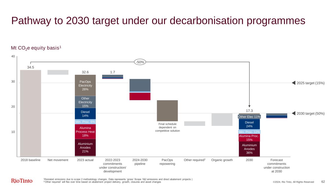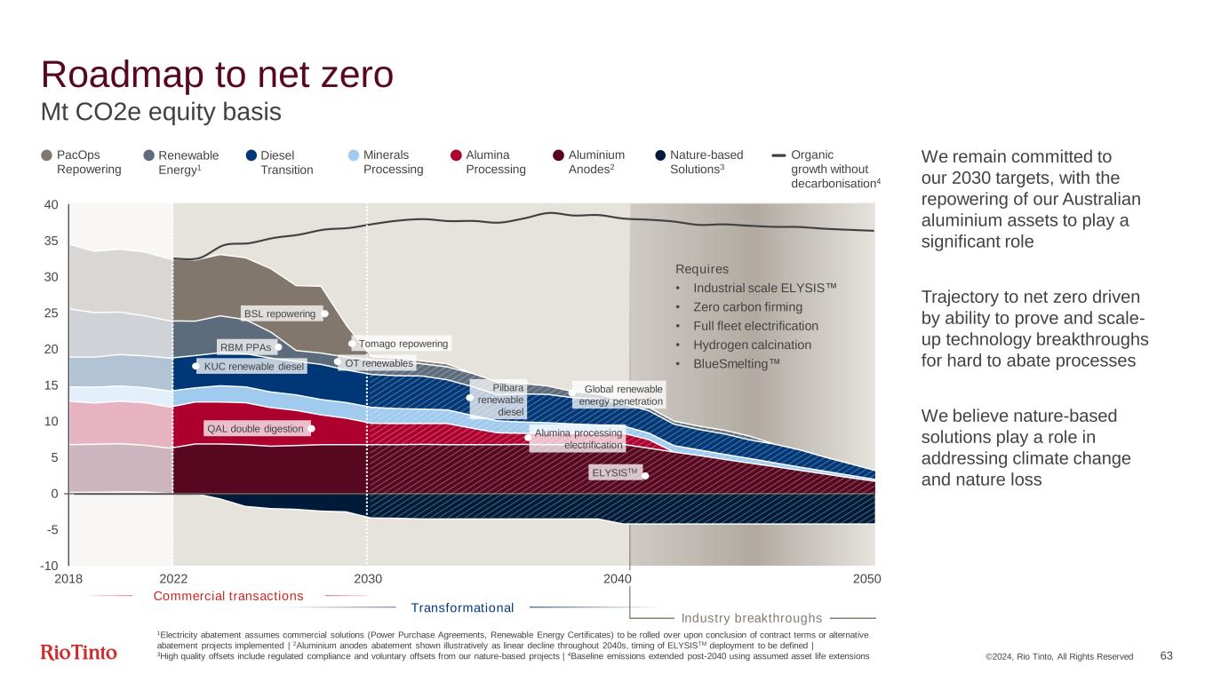 ©2024, Rio Tinto, All Rights Reserved 62 Pathway to 2030 target under our decarbonisation programmes 34.5 10 20 30 40 2030 Forecast commitments under construction at 2030 PacOps Electricity 26% 2018 baseline Net movement Other Electricity 15% 2030 target (50%) Diesel 14% 2025 target (15%) Min. Proc. 6% Alumina Process Heat 18% Aluminium Anodes 21% 2023 actual 2022-2023 commitments under construction/ development 2024-2030 pipeline PacOps repowering Other required2 Organic growth Other Elec 11% Diesel 24% Min. Proc. 12% Alumina Proc. 15% 32.6 1.7 17.3 Aluminium Anodes 36% -50% Final schedule dependent on competitive solution Mt CO2e equity basis1 1Restated emissions due to scope 2 methodology changes. Data represents ‘gross’ Scope 1&2 emissions and direct abatement projects | 2‘Other required’ will flex over time based on abatement project delivery, growth, closures and asset changes