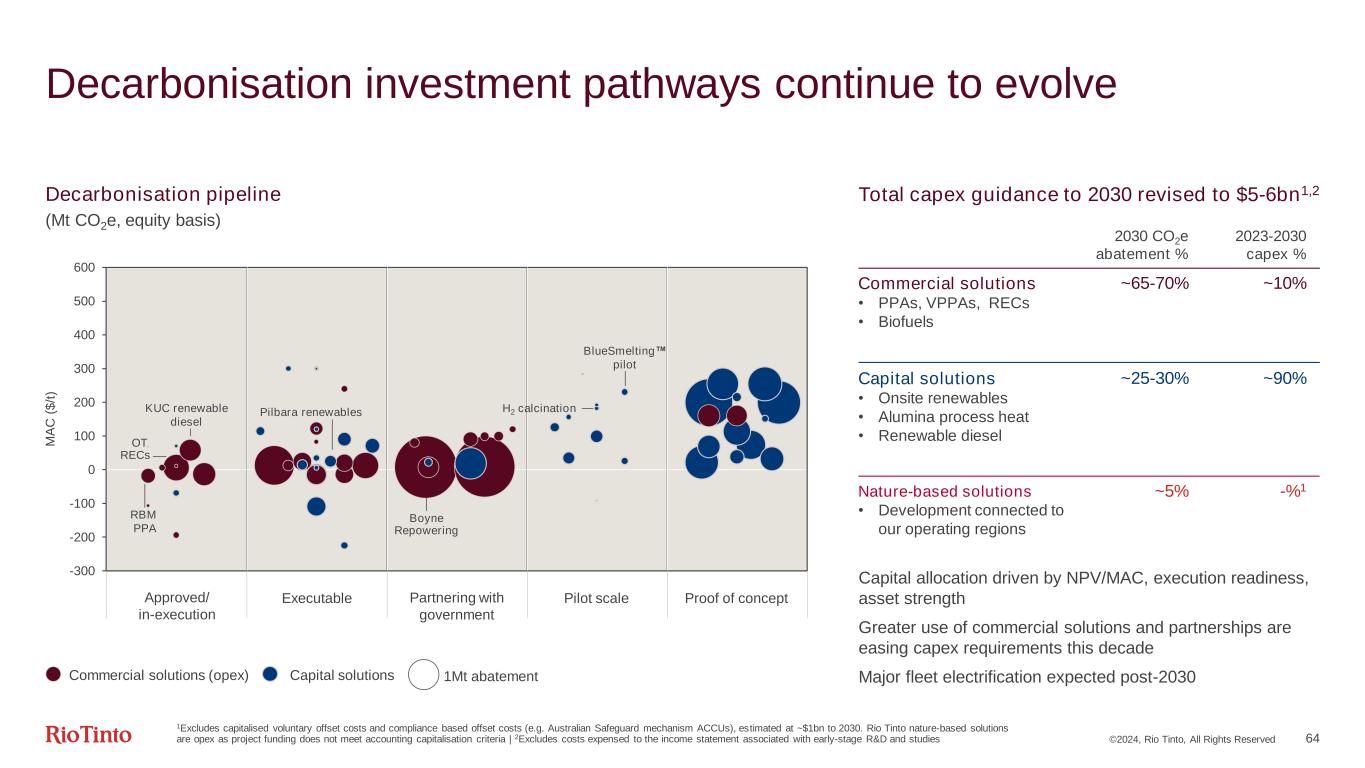 Commercial transactions Transformational ©2024, Rio Tinto, All Rights Reserved 63 Roadmap to net zero Mt CO2e equity basis 1Electricity abatement assumes commercial solutions (Power Purchase Agreements, Renewable Energy Certificates) to be rolled over upon conclusion of contract terms or alternative abatement projects implemented | 2Aluminium anodes abatement shown illustratively as linear decline throughout 2040s, timing of ELYSISTM deployment to be defined | 3High quality offsets include regulated compliance and voluntary offsets from our nature-based projects | 4Baseline emissions extended post-2040 using assumed asset life extensions Requires • Industrial scale ELYSIS™ • Zero carbon firming • Full fleet electrification • Hydrogen calcination • BlueSmelting™ -10 -5 0 5 10 15 20 25 30 35 40 2018 2030 2040 20502022 Renewable Energy1 Diesel Transition Minerals Processing Alumina Processing PacOps Repowering KUC renewable diesel RBM PPAs QAL double digestion BSL repowering Industry breakthroughs Aluminium Anodes2 Nature-based Solutions3 Organic growth without decarbonisation4 We remain committed to our 2030 targets, with the repowering of our Australian aluminium assets to play a significant role Trajectory to net zero driven by ability to prove and scale- up technology breakthroughs for hard to abate processes We believe nature-based solutions play a role in addressing climate change and nature loss Pilbara renewable diesel Alumina processing electrification Global renewable energy penetration Tomago repowering OT renewables ELYSISTM