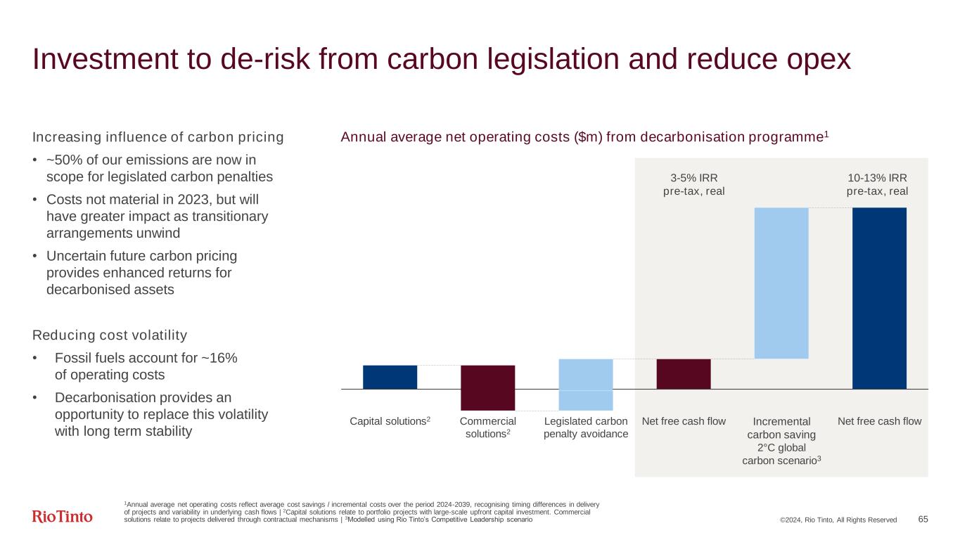 ©2024, Rio Tinto, All Rights Reserved 64 Decarbonisation investment pathways continue to evolve Decarbonisation pipeline (Mt CO2e, equity basis) Approved/ in-execution Executable Pilot scalePartnering with government Proof of concept -300 -200 -100 0 100 200 300 400 500 600 M A C ( $ /t ) Commercial solutions (opex) Capital solutions 1Mt abatement Capital allocation driven by NPV/MAC, execution readiness, asset strength Greater use of commercial solutions and partnerships are easing capex requirements this decade Major fleet electrification expected post-2030 Total capex guidance to 2030 revised to $5-6bn1,2 RBM PPA BlueSmelting™ pilot OT RECs KUC renewable diesel Boyne Repowering Pilbara renewables H2 calcination 1Excludes capitalised voluntary offset costs and compliance based offset costs (e.g. Australian Safeguard mechanism ACCUs), estimated at ~$1bn to 2030. Rio Tinto nature-based solutions are opex as project funding does not meet accounting capitalisation criteria | 2Excludes costs expensed to the income statement associated with early-stage R&D and studies Nature-based solutions • Development connected to our operating regions ~5% -%1 Capital solutions • Onsite renewables • Alumina process heat • Renewable diesel ~25-30% ~90% 2023-2030 capex % 2030 CO2e abatement % Commercial solutions • PPAs, VPPAs, RECs • Biofuels ~65-70% ~10%
