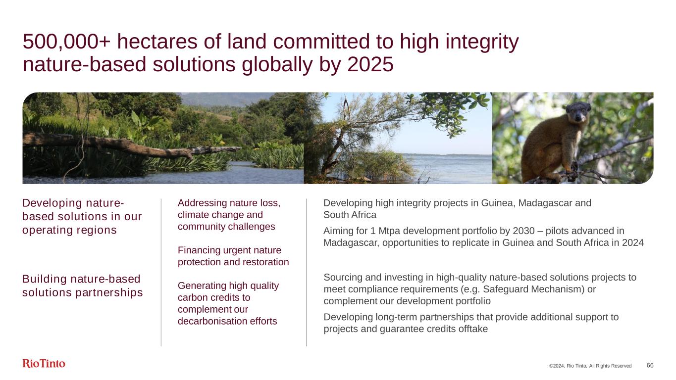 ©2024, Rio Tinto, All Rights Reserved 65 Investment to de-risk from carbon legislation and reduce opex Capital solutions2 Commercial solutions2 Legislated carbon penalty avoidance Net free cash flow Incremental carbon saving 2°C global carbon scenario3 Net free cash flow Annual average net operating costs ($m) from decarbonisation programme1 3-5% IRR pre-tax, real 10-13% IRR pre-tax, real 1Annual average net operating costs reflect average cost savings / incremental costs over the period 2024-2039, recognising timing differences in delivery of projects and variability in underlying cash flows | 2Capital solutions relate to portfolio projects with large-scale upfront capital investment. Commercial solutions relate to projects delivered through contractual mechanisms | 3Modelled using Rio Tinto’s Competitive Leadership scenario Increasing influence of carbon pricing • ~50% of our emissions are now in scope for legislated carbon penalties • Costs not material in 2023, but will have greater impact as transitionary arrangements unwind • Uncertain future carbon pricing provides enhanced returns for decarbonised assets Reducing cost volatility • Fossil fuels account for ~16% of operating costs • Decarbonisation provides an opportunity to replace this volatility with long term stability
