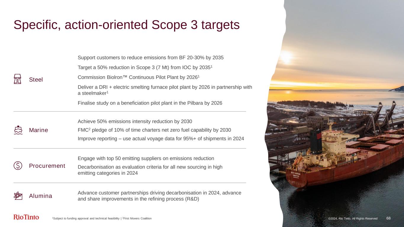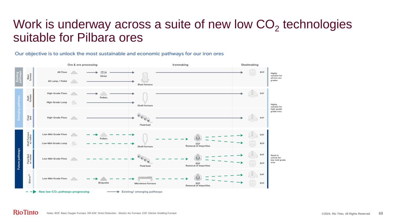 ©2024, Rio Tinto, All Rights Reserved 68 Specific, action-oriented Scope 3 targets 1Subject to funding approval and technical feasibility | 2First Movers Coalition Engage with top 50 emitting suppliers on emissions reduction Decarbonisation as evaluation criteria for all new sourcing in high emitting categories in 2024 Advance customer partnerships driving decarbonisation in 2024, advance and share improvements in the refining process (R&D) Procurement Alumina Marine Steel Support customers to reduce emissions from BF 20-30% by 2035 Target a 50% reduction in Scope 3 (7 Mt) from IOC by 20351 Commission Biolron™ Continuous Pilot Plant by 20261 Deliver a DRI + electric smelting furnace pilot plant by 2026 in partnership with a steelmaker1 Finalise study on a beneficiation pilot plant in the Pilbara by 2026 Achieve 50% emissions intensity reduction by 2030 FMC2 pledge of 10% of time charters net zero fuel capability by 2030 Improve reporting – use actual voyage data for 95%+ of shipments in 2024