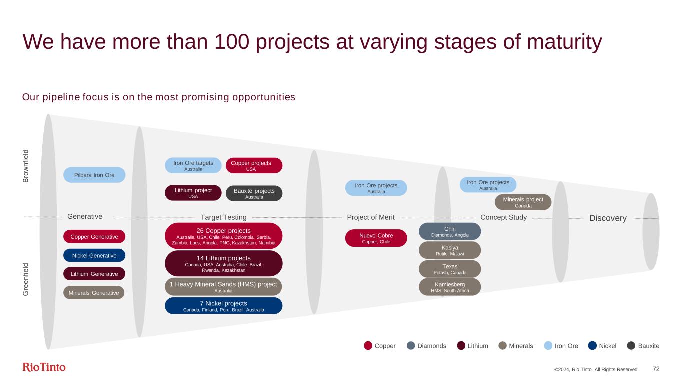 Extensive network of partners ©2024, Rio Tinto, All Rights Reserved 71 Building on our history and enabling growth World-class exploration team ~$400m annual spend ~$250m1 annual spend 450 employees 18 countries 8 commodities >100 projects in pipeline >50% of spend targeted at copper >70 years of experience R&D and data analytics to accelerate discovery Strong technology and R&D pedigree 1Greenfield exploration expenditure | 2Over 10 years 5 key focus areas for R&D Venture capital investments for agility Innovation Advisory Committee $150m for Centre for Future Materials2
