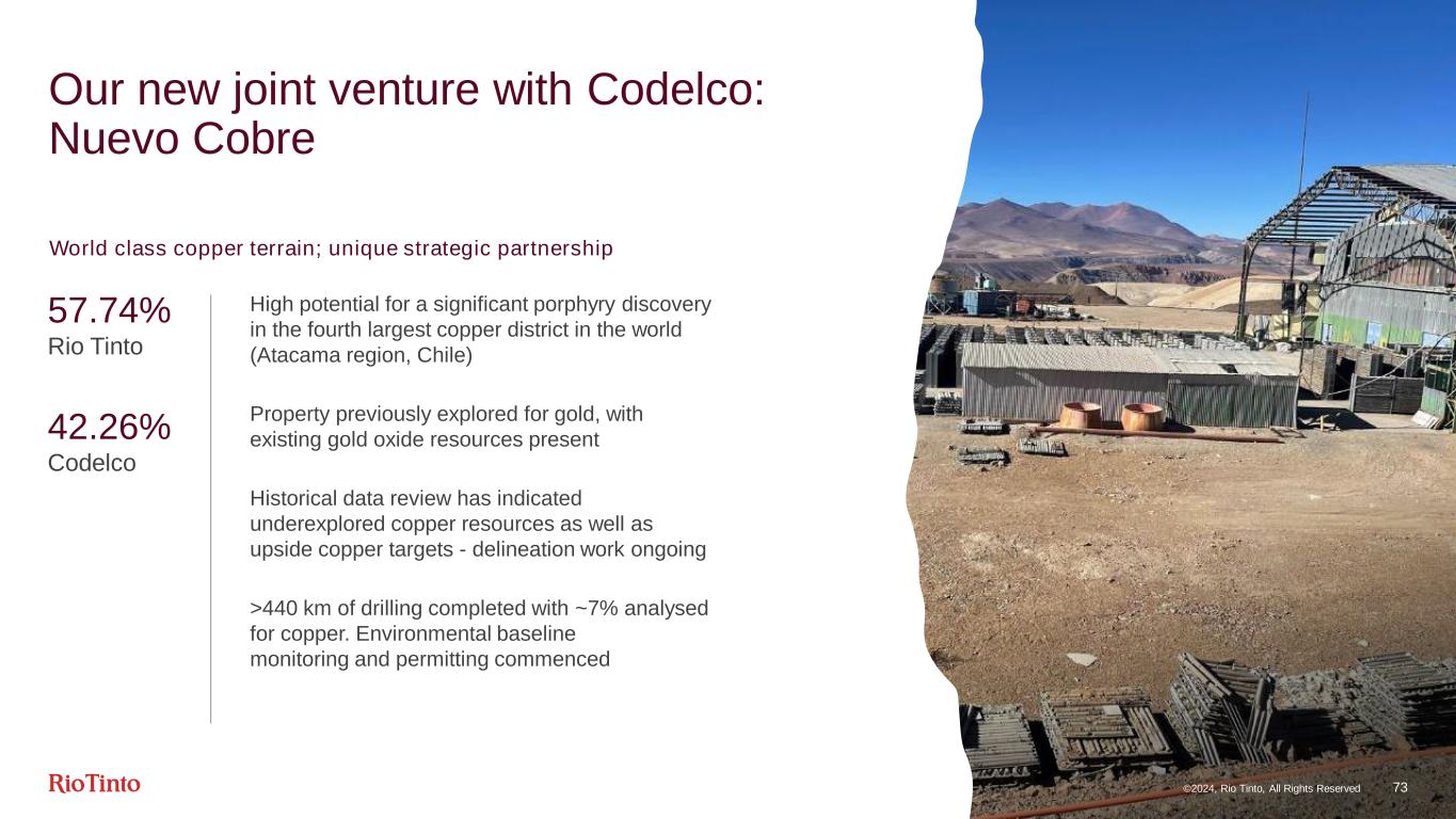 ©2024, Rio Tinto, All Rights Reserved 73 Our new joint venture with Codelco: Nuevo Cobre World class copper terrain; unique strategic partnership 57.74% Rio Tinto 42.26% Codelco High potential for a significant porphyry discovery in the fourth largest copper district in the world (Atacama region, Chile) Property previously explored for gold, with existing gold oxide resources present Historical data review has indicated underexplored copper resources as well as upside copper targets - delineation work ongoing >440 km of drilling completed with ~7% analysed for copper. Environmental baseline monitoring and permitting commenced