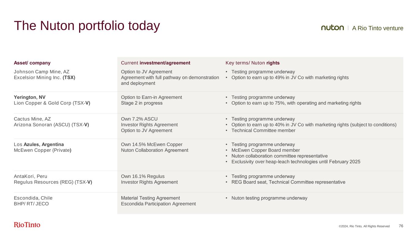 Yerington Lion CG ©2024, Rio Tinto, All Rights Reserved 75 NutonTM A high-recovery and low-footprint technology Outstanding copper recovery rates: CO2e emissions up to 60% lower Water consumption >80% more efficient Tailings requirement None Capital intensity >40% lower Cactus ASCU Los Azules McEwen Antakori Regulus Johnson Camp Excelsior Escondida BHP Commercial demonstration Viability study and testing Leading sustainability credentials High-performing technology: Multiple applications up to 85% on primary copper sulphide ore bodies Aim to produce world’s lowest footprint copper across our five pillars, and stretch to have a positive impact in at least one: SocietyMaterialsLandWaterEnergy Partnering with resource holders to access copper volumes 6 Partnerships 4 Countries Partnership approach: Key differentiators Portfolio ​ today 01 02 1Will vary depending from site to site, ore characteristics and operating environment. Rio Tinto analysis. Nuton’s performance1 vs. conventional concentrating/smelting A Rio Tinto venture