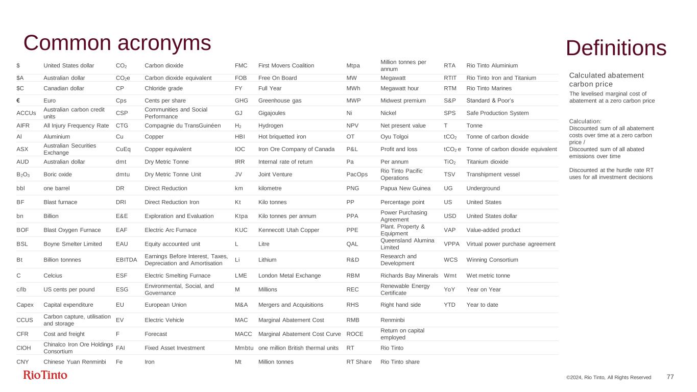 ©2024, Rio Tinto, All Rights Reserved 77 Common acronyms $ United States dollar CO2 Carbon dioxide FMC First Movers Coalition Mtpa Million tonnes per annum RTA Rio Tinto Aluminium $A Australian dollar CO2e Carbon dioxide equivalent FOB Free On Board MW Megawatt RTIT Rio Tinto Iron and Titanium $C Canadian dollar CP Chloride grade FY Full Year MWh Megawatt hour RTM Rio Tinto Marines € Euro Cps Cents per share GHG Greenhouse gas MWP Midwest premium S&P Standard & Poor’s ACCUs Australian carbon credit units CSP Communities and Social Performance GJ Gigajoules Ni Nickel SPS Safe Production System AIFR All Injury Frequency Rate CTG Compagnie du TransGuinéen H2 Hydrogen NPV Net present value T Tonne Al Aluminium Cu Copper HBI Hot briquetted iron OT Oyu Tolgoi tCO2 Tonne of carbon dioxide ASX Australian Securities Exchange CuEq Copper equivalent IOC Iron Ore Company of Canada P&L Profit and loss tCO2 e Tonne of carbon dioxide equivalent AUD Australian dollar dmt Dry Metric Tonne IRR Internal rate of return Pa Per annum TiO2 Titanium dioxide B2O3 Boric oxide dmtu Dry Metric Tonne Unit JV Joint Venture PacOps Rio Tinto Pacific Operations TSV Transhipment vessel bbl one barrel DR Direct Reduction km kilometre PNG Papua New Guinea UG Underground BF Blast furnace DRI Direct Reduction Iron Kt Kilo tonnes PP Percentage point US United States bn Billion E&E Exploration and Evaluation Ktpa Kilo tonnes per annum PPA Power Purchasing Agreement USD United States dollar BOF Blast Oxygen Furnace EAF Electric Arc Furnace KUC Kennecott Utah Copper PPE Plant. Property & Equipment VAP Value-added product BSL Boyne Smelter Limited EAU Equity accounted unit L Litre QAL Queensland Alumina Limited VPPA Virtual power purchase agreement Bt Billion tonnnes EBITDA Earnings Before Interest, Taxes, Depreciation and Amortisation Li Lithium R&D Research and Development WCS Winning Consortium C Celcius ESF Electric Smelting Furnace LME London Metal Exchange RBM Richards Bay Minerals Wmt Wet metric tonne c/lb US cents per pound ESG Environmental, Social, and Governance M Millions REC Renewable Energy Certificate YoY Year on Year Capex Capital expenditure EU European Union M&A Mergers and Acquisitions RHS Right hand side YTD Year to date CCUS Carbon capture, utilisation and storage EV Electric Vehicle MAC Marginal Abatement Cost RMB Renminbi CFR Cost and freight F Forecast MACC Marginal Abatement Cost Curve ROCE Return on capital employed CIOH Chinalco Iron Ore Holdings Consortium FAI Fixed Asset Investment Mmbtu one million British thermal units RT Rio Tinto CNY Chinese Yuan Renminbi Fe Iron Mt Million tonnes RT Share Rio Tinto share Definitions Calculated abatement carbon price The levelised marginal cost of abatement at a zero carbon price Calculation: Discounted sum of all abatement costs over time at a zero carbon price / Discounted sum of all abated emissions over time Discounted at the hurdle rate RT uses for all investment decisions