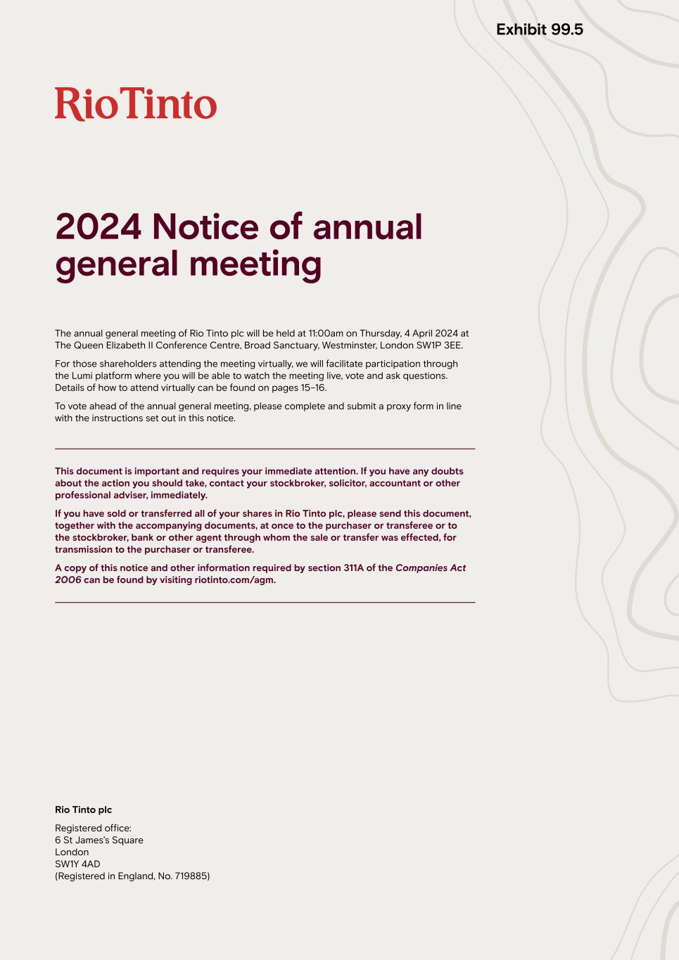 The annual general meeting of Rio Tinto plc will be held at 11:00am on Thursday, 4 April 2024 at The Queen Elizabeth II Conference Centre, Broad Sanctuary, Westminster, London SW1P 3EE. For those shareholders attending the meeting virtually, we will facilitate participation through the Lumi platform where you will be able to watch the meeting live, vote and ask questions. Details of how to attend virtually can be found on pages 15–16. To vote ahead of the annual general meeting, please complete and submit a proxy form in line with the instructions set out in this notice. This document is important and requires your immediate attention. If you have any doubts about the action you should take, contact your stockbroker, solicitor, accountant or other professional adviser, immediately. If you have sold or transferred all of your shares in Rio Tinto plc, please send this document, together with the accompanying documents, at once to the purchaser or transferee or to the stockbroker, bank or other agent through whom the sale or transfer was effected, for transmission to the purchaser or transferee. A copy of this notice and other information required by section 311A of the Companies Act 2006 can be found by visiting riotinto.com/agm. 2024 Notice of annual general meeting Rio Tinto plc Registered office: 6 St James’s Square London SW1Y 4AD (Registered in England, No. 719885) Exhibit 99.5