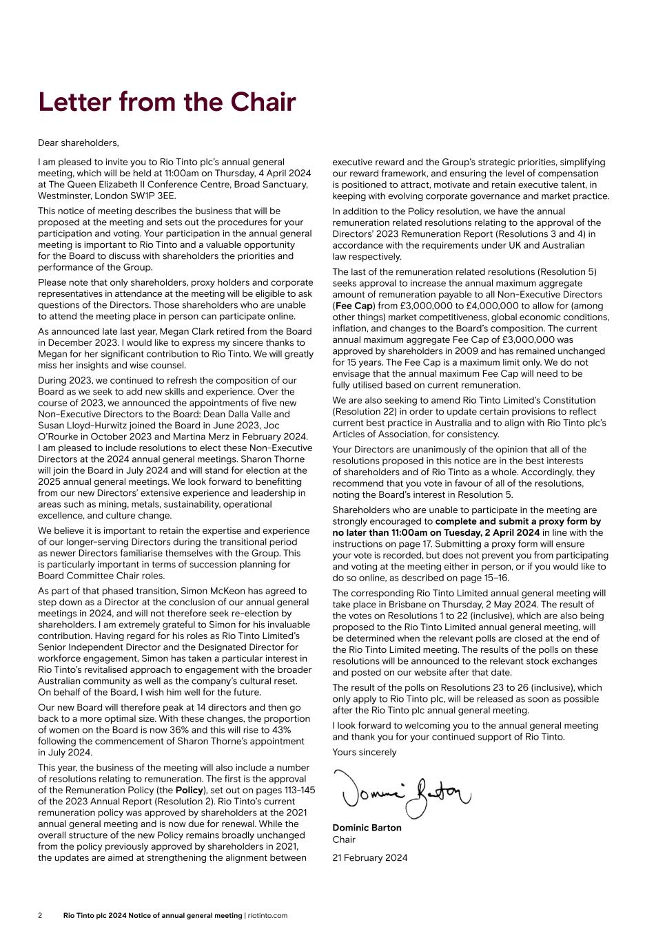 Letter from the Chair Dear shareholders, I am pleased to invite you to Rio Tinto plc’s annual general meeting, which will be held at 11:00am on Thursday, 4 April 2024 at The Queen Elizabeth II Conference Centre, Broad Sanctuary, Westminster, London SW1P 3EE. This notice of meeting describes the business that will be proposed at the meeting and sets out the procedures for your participation and voting. Your participation in the annual general meeting is important to Rio Tinto and a valuable opportunity for the Board to discuss with shareholders the priorities and performance of the Group. Please note that only shareholders, proxy holders and corporate representatives in attendance at the meeting will be eligible to ask questions of the Directors. Those shareholders who are unable to attend the meeting place in person can participate online. As announced late last year, Megan Clark retired from the Board in December 2023. I would like to express my sincere thanks to Megan for her significant contribution to Rio Tinto. We will greatly miss her insights and wise counsel. During 2023, we continued to refresh the composition of our Board as we seek to add new skills and experience. Over the course of 2023, we announced the appointments of five new Non-Executive Directors to the Board: Dean Dalla Valle and Susan Lloyd-Hurwitz joined the Board in June 2023, Joc O’Rourke in October 2023 and Martina Merz in February 2024. I am pleased to include resolutions to elect these Non-Executive Directors at the 2024 annual general meetings. Sharon Thorne will join the Board in July 2024 and will stand for election at the 2025 annual general meetings. We look forward to benefitting from our new Directors’ extensive experience and leadership in areas such as mining, metals, sustainability, operational excellence, and culture change. We believe it is important to retain the expertise and experience of our longer-serving Directors during the transitional period as newer Directors familiarise themselves with the Group. This is particularly important in terms of succession planning for Board Committee Chair roles. As part of that phased transition, Simon McKeon has agreed to step down as a Director at the conclusion of our annual general meetings in 2024, and will not therefore seek re-election by shareholders. I am extremely grateful to Simon for his invaluable contribution. Having regard for his roles as Rio Tinto Limited’s Senior Independent Director and the Designated Director for workforce engagement, Simon has taken a particular interest in Rio Tinto’s revitalised approach to engagement with the broader Australian community as well as the company’s cultural reset. On behalf of the Board, I wish him well for the future. Our new Board will therefore peak at 14 directors and then go back to a more optimal size. With these changes, the proportion of women on the Board is now 36% and this will rise to 43% following the commencement of Sharon Thorne’s appointment in July 2024. This year, the business of the meeting will also include a number of resolutions relating to remuneration. The first is the approval of the Remuneration Policy (the Policy), set out on pages 113-145 of the 2023 Annual Report (Resolution 2). Rio Tinto’s current remuneration policy was approved by shareholders at the 2021 annual general meeting and is now due for renewal. While the overall structure of the new Policy remains broadly unchanged from the policy previously approved by shareholders in 2021, the updates are aimed at strengthening the alignment between executive reward and the Group’s strategic priorities, simplifying our reward framework, and ensuring the level of compensation is positioned to attract, motivate and retain executive talent, in keeping with evolving corporate governance and market practice. In addition to the Policy resolution, we have the annual remuneration related resolutions relating to the approval of the Directors’ 2023 Remuneration Report (Resolutions 3 and 4) in accordance with the requirements under UK and Australian law respectively. The last of the remuneration related resolutions (Resolution 5) seeks approval to increase the annual maximum aggregate amount of remuneration payable to all Non-Executive Directors (Fee Cap) from £3,000,000 to £4,000,000 to allow for (among other things) market competitiveness, global economic conditions, inflation, and changes to the Board’s composition. The current annual maximum aggregate Fee Cap of £3,000,000 was approved by shareholders in 2009 and has remained unchanged for 15 years. The Fee Cap is a maximum limit only. We do not envisage that the annual maximum Fee Cap will need to be fully utilised based on current remuneration. We are also seeking to amend Rio Tinto Limited’s Constitution (Resolution 22) in order to update certain provisions to reflect current best practice in Australia and to align with Rio Tinto plc’s Articles of Association, for consistency. Your Directors are unanimously of the opinion that all of the resolutions proposed in this notice are in the best interests of shareholders and of Rio Tinto as a whole. Accordingly, they recommend that you vote in favour of all of the resolutions, noting the Board’s interest in Resolution 5. Shareholders who are unable to participate in the meeting are strongly encouraged to complete and submit a proxy form by no later than 11:00am on Tuesday, 2 April 2024 in line with the instructions on page 17. Submitting a proxy form will ensure your vote is recorded, but does not prevent you from participating and voting at the meeting either in person, or if you would like to do so online, as described on page 15–16. The corresponding Rio Tinto Limited annual general meeting will take place in Brisbane on Thursday, 2 May 2024. The result of the votes on Resolutions 1 to 22 (inclusive), which are also being proposed to the Rio Tinto Limited annual general meeting, will be determined when 