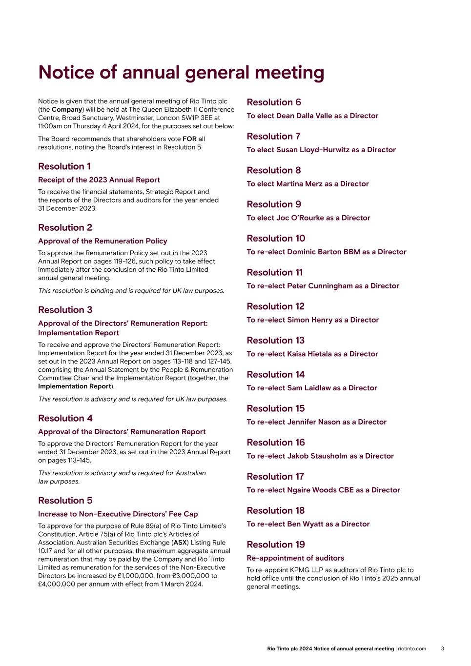 Notice of annual general meeting Notice is given that the annual general meeting of Rio Tinto plc (the Company) will be held at The Queen Elizabeth II Conference Centre, Broad Sanctuary, Westminster, London SW1P 3EE at 11:00am on Thursday 4 April 2024, for the purposes set out below: The Board recommends that shareholders vote FOR all resolutions, noting the Board’s interest in Resolution 5. Resolution 1 Receipt of the 2023 Annual Report To receive the financial statements, Strategic Report and the reports of the Directors and auditors for the year ended 31 December 2023. Resolution 2 Approval of the Remuneration Policy To approve the Remuneration Policy set out in the 2023 Annual Report on pages 119-126, such policy to take effect immediately after the conclusion of the Rio Tinto Limited annual general meeting. This resolution is binding and is required for UK law purposes. Resolution 3 Approval of the Directors’ Remuneration Report: Implementation Report To receive and approve the Directors’ Remuneration Report: Implementation Report for the year ended 31 December 2023, as set out in the 2023 Annual Report on pages 113-118 and 127-145, comprising the Annual Statement by the People & Remuneration Committee Chair and the Implementation Report (together, the Implementation Report). This resolution is advisory and is required for UK law purposes. Resolution 4 Approval of the Directors’ Remuneration Report To approve the Directors’ Remuneration Report for the year ended 31 December 2023, as set out in the 2023 Annual Report on pages 113-145. This resolution is advisory and is required for Australian law purposes. Resolution 5 Increase to Non-Executive Directors’ Fee Cap To approve for the purpose of Rule 89(a) of Rio Tinto Limited’s Constitution, Article 75(a) of Rio Tinto plc’s Articles of Association, Australian Securities Exchange (ASX) Listing Rule 10.17 and for all other purposes, the maximum aggregate annual remuneration that may be paid by the Company and Rio Tinto Limited as remuneration for the services of the Non-Executive Directors be increased by £1,000,000, from £3,000,000 to £4,000,000 per annum with effect from 1 March 2024. Resolution 6 To elect Dean Dalla Valle as a Director Resolution 7 To elect Susan Lloyd-Hurwitz as a Director Resolution 8 To elect Martina Merz as a Director Resolution 9 To elect Joc O’Rourke as a Director Resolution 10 To re-elect Dominic Barton BBM as a Director Resolution 11 To re-elect Peter Cunningham as a Director Resolution 12 To re-elect Simon Henry as a Director Resolution 13 To re-elect Kaisa Hietala as a Director Resolution 14 To re-elect Sam Laidlaw as a Director Resolution 15 To re-elect Jennifer Nason as a Director Resolution 16 To re-elect Jakob Stausholm as a Director Resolution 17 To re-elect Ngaire Woods CBE as a Director Resolution 18 To re-elect Ben Wyatt as a Director Resolution 19 Re-appointment of auditors To re-appoint KPMG LLP as auditors of Rio Tinto plc to hold office until the conclusion of Rio Tinto’s 2025 annual general meetings. 3Rio Tinto plc 2024 Notice of annual general meeting | riotinto.com