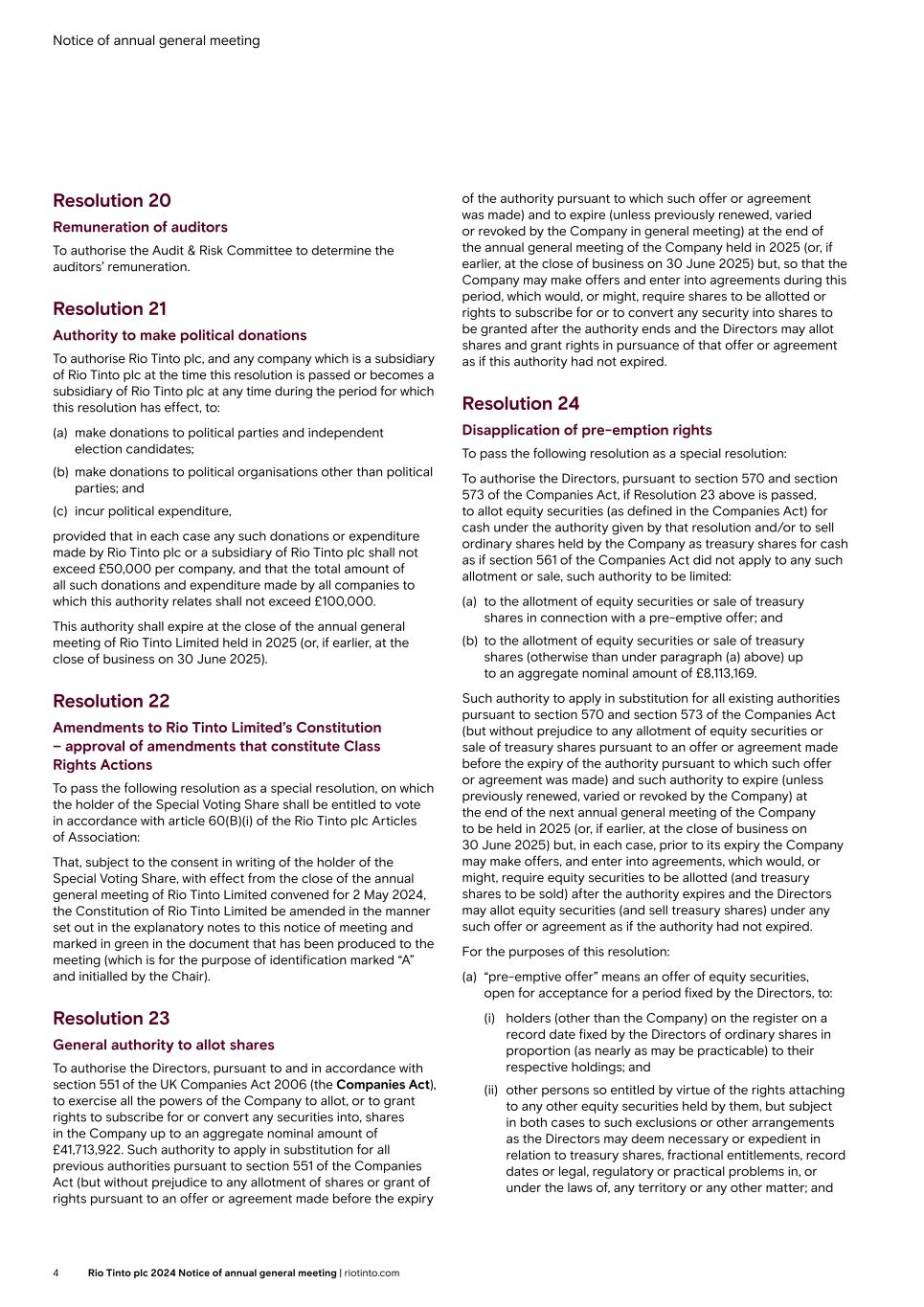 Notice of annual general meeting Resolution 20 Remuneration of auditors To authorise the Audit & Risk Committee to determine the auditors’ remuneration. Resolution 21 Authority to make political donations To authorise Rio Tinto plc, and any company which is a subsidiary of Rio Tinto plc at the time this resolution is passed or becomes a subsidiary of Rio Tinto plc at any time during the period for which this resolution has effect, to: (a) make donations to political parties and independent election candidates; (b) make donations to political organisations other than political parties; and (c) incur political expenditure, provided that in each case any such donations or expenditure made by Rio Tinto plc or a subsidiary of Rio Tinto plc shall not exceed £50,000 per company, and that the total amount of all such donations and expenditure made by all companies to which this authority relates shall not exceed £100,000. This authority shall expire at the close of the annual general meeting of Rio Tinto Limited held in 2025 (or, if earlier, at the close of business on 30 June 2025). Resolution 22 Amendments to Rio Tinto Limited’s Constitution – approval of amendments that constitute Class Rights Actions To pass the following resolution as a special resolution, on which the holder of the Special Voting Share shall be entitled to vote in accordance with article 60(B)(i) of the Rio Tinto plc Articles of Association: That, subject to the consent in writing of the holder of the Special Voting Share, with effect from the close of the annual general meeting of Rio Tinto Limited convened for 2 May 2024, the Constitution of Rio Tinto Limited be amended in the manner set out in the explanatory notes to this notice of meeting and marked in green in the document that has been produced to the meeting (which is for the purpose of identification marked “A” and initialled by the Chair). Resolution 23 General authority to allot shares To authorise the Directors, pursuant to and in accordance with section 551 of the UK Companies Act 2006 (the Companies Act), to exercise all the powers of the Company to allot, or to grant rights to subscribe for or convert any securities into, shares in the Company up to an aggregate nominal amount of £41,713,922. Such authority to apply in substitution for all previous authorities pursuant to section 551 of the Companies Act (but without prejudice to any allotment of shares or grant of rights pursuant to an offer or agreement made before the expiry of the authority pursuant to which such offer or agreement was made) and to expire (unless previously renewed, varied or revoked by the Company in general meeting) at the end of the annual general meeting of the Company held in 2025 (or, if earlier, at the close of business on 30 June 2025) but, so that the Company may make offers and enter into agreements during this period, which would, or might, require shares to be allotted or rights to subscribe for or to convert any security into shares to be granted after the authority ends and the Directors may allot shares and grant rights in pursuance of that offer or agreement as if this authority had not expired. Resolution 24 Disapplication of pre-emption rights To pass the following resolution as a special resolution: To authorise the Directors, pursuant to section 570 and section 573 of the Companies Act, if Resolution 23 above is passed, to allot equity securities (as defined in the Companies Act) for cash under the authority given by that resolution and/or to sell ordinary shares held by the Company as treasury shares for cash as if section 561 of the Companies Act did not apply to any such allotment or sale, such authority to be limited: (a) to the allotment of equity securities or sale of treasury shares in connection with a pre-emptive offer; and (b) to the allotment of equity securities or sale of treasury shares (otherwise than under paragraph (a) above) up to an aggregate nominal amount of £8,113,169. Such authority to apply in substitution for all existing authorities pursuant to section 570 and section 573 of the Companies Act (but without prejudice to any allotment of equity securities or sale of treasury shares pursuant to an offer or agreement made before the expiry of the authority pursuant to which such offer or agreement was made) and such authority to expire (unless previously renewed, varied or revoked by the Company) at the end of the next annual general meeting of the Company to be held in 2025 (or, if earlier, at the close of business on 30 June 2025) but, in each case, prior to its expiry the Company may make offers, and enter into agreements, which would, or might, require equity securities to be allotted (and treasury shares to be sold) after the authority expires and the Directors may allot equity securities (and sell treasury shares) under any such offer or agreement as if the authority had not expired. For the purposes of this resolution: (a) “pre-emptive offer” means an offer of equity securities, open for acceptance for a period fixed by the Directors, to: (i) holders (other than the Company) on the register on a record date fixed by the Directors of ordinary shares in proportion (as nearly as may be practicable) to their respective holdings; and (ii) other persons so entitled by virtue of the rights attaching to any other equity securities held by them, but subject in both cases to such exclusions or other arrangements as the Directors may deem necessary or expedient in relation to treasury shares, fractional entitlements, record dates or legal, regulatory or practical problems in, or under the laws of, any territory or any other matter; and 4 Rio Tinto plc 2024 Notice of annual general meeting | riotinto.com