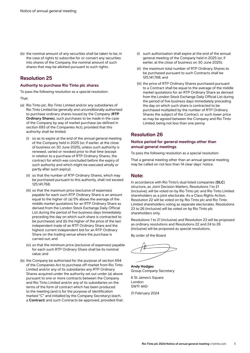 Notice of annual general meeting (b) the nominal amount of any securities shall be taken to be, in the case of rights to subscribe for or convert any securities into shares of the Company, the nominal amount of such shares that may be allotted pursuant to such rights. Resolution 25 Authority to purchase Rio Tinto plc shares To pass the following resolution as a special resolution: That: (a) Rio Tinto plc, Rio Tinto Limited and/or any subsidiaries of Rio Tinto Limited be generally and unconditionally authorised to purchase ordinary shares issued by the Company (RTP Ordinary Shares), such purchases to be made in the case of the Company by way of market purchase (as defined in section 693 of the Companies Act), provided that this authority shall be limited: (i) so as to expire at the end of the annual general meeting of the Company held in 2025 (or, if earlier, at the close of business on 30 June 2025), unless such authority is renewed, varied or revoked prior to that time (except in relation to a purchase of RTP Ordinary Shares, the contract for which was concluded before the expiry of such authority and which might be executed wholly or partly after such expiry); (ii) so that the number of RTP Ordinary Shares, which may be purchased pursuant to this authority, shall not exceed 125,141,768; (iii) so that the maximum price (exclusive of expenses) payable for each such RTP Ordinary Share is an amount equal to the higher of: (a) 5% above the average of the middle market quotations for an RTP Ordinary Share as derived from the London Stock Exchange Daily Official List during the period of five business days immediately preceding the day on which such share is contracted to be purchased; and (b) the higher of the price of the last independent trade of an RTP Ordinary Share and the highest current independent bid for an RTP Ordinary Share on the trading venue where the purchase is carried out; and (iv) so that the minimum price (exclusive of expenses) payable for each such RTP Ordinary Share shall be its nominal value; and (b) the Company be authorised for the purpose of section 694 of the Companies Act to purchase off-market from Rio Tinto Limited and/or any of its subsidiaries any RTP Ordinary Shares acquired under the authority set out under (a) above pursuant to one or more contracts between the Company and Rio Tinto Limited and/or any of its subsidiaries on the terms of the form of contract which has been produced to the meeting (and is for the purpose of identification marked “C” and initialled by the Company Secretary) (each, a Contract) and such Contracts be approved, provided that: (i) such authorisation shall expire at the end of the annual general meeting of the Company held in 2025 (or, if earlier, at the close of business on 30 June 2025); (ii) the maximum total number of RTP Ordinary Shares to be purchased pursuant to such Contracts shall be 125,141,768; and (iii) the price of RTP Ordinary Shares purchased pursuant to a Contract shall be equal to the average of the middle market quotations for an RTP Ordinary Share as derived from the London Stock Exchange Daily Official List during the period of five business days immediately preceding the day on which such share is contracted to be purchased multiplied by the number of RTP Ordinary Shares the subject of the Contract, or such lower price as may be agreed between the Company and Rio Tinto Limited, being not less than one penny. Resolution 26 Notice period for general meetings other than annual general meetings To pass the following resolution as a special resolution: That a general meeting other than an annual general meeting may be called on not less than 14 clear days’ notice. Note: In accordance with Rio Tinto’s dual listed companies (DLC) structure, as Joint Decision Matters, Resolutions 1 to 21 (inclusive), will be voted on by Rio Tinto plc and Rio Tinto Limited shareholders as a joint electorate. As a Class Rights Action, Resolution 22 will be voted on by Rio Tinto plc and Rio Tinto Limited shareholders voting as separate electorates. Resolutions 23 to 26 (inclusive) will be voted on by Rio Tinto plc shareholders only. Resolutions 1 to 21 (inclusive) and Resolution 23 will be proposed as ordinary resolutions and Resolutions 22 and 24 to 26 (inclusive) will be proposed as special resolutions. By order of the Board Andy Hodges Group Company Secretary 6 St James’s Square London SW1Y 4AD 21 February 2024 5Rio Tinto plc 2024 Notice of annual general meeting | riotinto.com