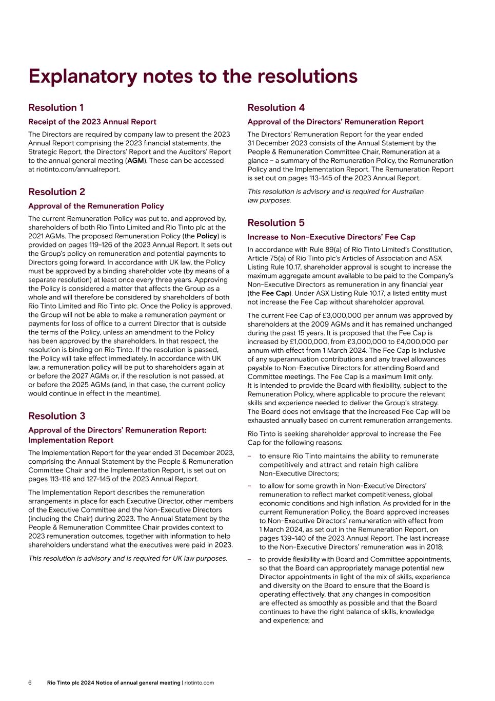 Explanatory notes to the resolutions Resolution 1 Receipt of the 2023 Annual Report The Directors are required by company law to present the 2023 Annual Report comprising the 2023 financial statements, the Strategic Report, the Directors’ Report and the Auditors’ Report to the annual general meeting (AGM). These can be accessed at riotinto.com/annualreport. Resolution 2 Approval of the Remuneration Policy The current Remuneration Policy was put to, and approved by, shareholders of both Rio Tinto Limited and Rio Tinto plc at the 2021 AGMs. The proposed Remuneration Policy (the Policy) is provided on pages 119-126 of the 2023 Annual Report. It sets out the Group’s policy on remuneration and potential payments to Directors going forward. In accordance with UK law, the Policy must be approved by a binding shareholder vote (by means of a separate resolution) at least once every three years. Approving the Policy is considered a matter that affects the Group as a whole and will therefore be considered by shareholders of both Rio Tinto Limited and Rio Tinto plc. Once the Policy is approved, the Group will not be able to make a remuneration payment or payments for loss of office to a current Director that is outside the terms of the Policy, unless an amendment to the Policy has been approved by the shareholders. In that respect, the resolution is binding on Rio Tinto. If the resolution is passed, the Policy will take effect immediately. In accordance with UK law, a remuneration policy will be put to shareholders again at or before the 2027 AGMs or, if the resolution is not passed, at or before the 2025 AGMs (and, in that case, the current policy would continue in effect in the meantime). Resolution 3 Approval of the Directors’ Remuneration Report: Implementation Report The Implementation Report for the year ended 31 December 2023, comprising the Annual Statement by the People & Remuneration Committee Chair and the Implementation Report, is set out on pages 113-118 and 127-145 of the 2023 Annual Report. The Implementation Report describes the remuneration arrangements in place for each Executive Director, other members of the Executive Committee and the Non-Executive Directors (including the Chair) during 2023. The Annual Statement by the People & Remuneration Committee Chair provides context to 2023 remuneration outcomes, together with information to help shareholders understand what the executives were paid in 2023. This resolution is advisory and is required for UK law purposes. Resolution 4 Approval of the Directors’ Remuneration Report The Directors’ Remuneration Report for the year ended 31 December 2023 consists of the Annual Statement by the People & Remuneration Committee Chair, Remuneration at a glance – a summary of the Remuneration Policy, the Remuneration Policy and the Implementation Report. The Remuneration Report is set out on pages 113-145 of the 2023 Annual Report. This resolution is advisory and is required for Australian law purposes. Resolution 5 Increase to Non-Executive Directors’ Fee Cap In accordance with Rule 89(a) of Rio Tinto Limited’s Constitution, Article 75(a) of Rio Tinto plc’s Articles of Association and ASX Listing Rule 10.17, shareholder approval is sought to increase the maximum aggregate amount available to be paid to the Company’s Non-Executive Directors as remuneration in any financial year (the Fee Cap). Under ASX Listing Rule 10.17, a listed entity must not increase the Fee Cap without shareholder approval. The current Fee Cap of £3,000,000 per annum was approved by shareholders at the 2009 AGMs and it has remained unchanged during the past 15 years. It is proposed that the Fee Cap is increased by £1,000,000, from £3,000,000 to £4,000,000 per annum with effect from 1 March 2024. The Fee Cap is inclusive of any superannuation contributions and any travel allowances payable to Non-Executive Directors for attending Board and Committee meetings. The Fee Cap is a maximum limit only. It is intended to provide the Board with flexibility, subject to the Remuneration Policy, where applicable to procure the relevant skills and experience needed to deliver the Group’s strategy. The Board does not envisage that the increased Fee Cap will be exhausted annually based on current remuneration arrangements. Rio Tinto is seeking shareholder approval to increase the Fee Cap for the following reasons: – to ensure Rio Tinto maintains the ability to remunerate competitively and attract and retain high calibre Non-Executive Directors; – to allow for some growth in Non-Executive Directors’ remuneration to reflect market competitiveness, global economic conditions and high inflation. As provided for in the current Remuneration Policy, the Board approved increases to Non-Executive Directors’ remuneration with effect from 1 March 2024, as set out in the Remuneration Report, on pages 139-140 of the 2023 Annual Report. The last increase to the Non-Executive Directors’ remuneration was in 2018; – to provide flexibility with Board and Committee appointments, so that the Board can appropriately manage potential new Director appointments in light of the mix of skills, experience and diversity on the Board to ensure that the Board is operating effectively, that any changes in composition are effected as smoothly as possible and that the Board continues to have the right balance of skills, knowledge and experience; and 6 Rio Tinto plc 2024 Notice of annual general meeting | riotinto.com