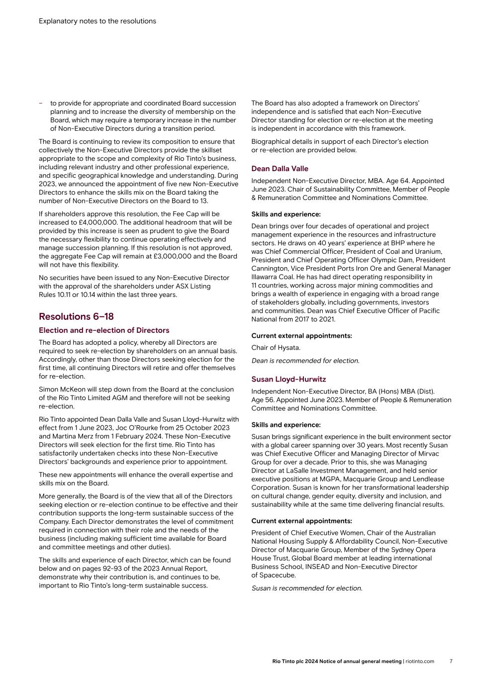Explanatory notes to the resolutions – to provide for appropriate and coordinated Board succession planning and to increase the diversity of membership on the Board, which may require a temporary increase in the number of Non-Executive Directors during a transition period. The Board is continuing to review its composition to ensure that collectively the Non-Executive Directors provide the skillset appropriate to the scope and complexity of Rio Tinto’s business, including relevant industry and other professional experience, and specific geographical knowledge and understanding. During 2023, we announced the appointment of five new Non-Executive Directors to enhance the skills mix on the Board taking the number of Non-Executive Directors on the Board to 13. If shareholders approve this resolution, the Fee Cap will be increased to £4,000,000. The additional headroom that will be provided by this increase is seen as prudent to give the Board the necessary flexibility to continue operating effectively and manage succession planning. If this resolution is not approved, the aggregate Fee Cap will remain at £3,000,000 and the Board will not have this flexibility. No securities have been issued to any Non-Executive Director with the approval of the shareholders under ASX Listing Rules 10.11 or 10.14 within the last three years. Resolutions 6–18 Election and re-election of Directors The Board has adopted a policy, whereby all Directors are required to seek re-election by shareholders on an annual basis. Accordingly, other than those Directors seeking election for the first time, all continuing Directors will retire and offer themselves for re-election. Simon McKeon will step down from the Board at the conclusion of the Rio Tinto Limited AGM and therefore will not be seeking re-election. Rio Tinto appointed Dean Dalla Valle and Susan Lloyd-Hurwitz with effect from 1 June 2023, Joc O’Rourke from 25 October 2023 and Martina Merz from 1 February 2024. These Non-Executive Directors will seek election for the first time. Rio Tinto has satisfactorily undertaken checks into these Non-Executive Directors’ backgrounds and experience prior to appointment. These new appointments will enhance the overall expertise and skills mix on the Board. More generally, the Board is of the view that all of the Directors seeking election or re-election continue to be effective and their contribution supports the long-term sustainable success of the Company. Each Director demonstrates the level of commitment required in connection with their role and the needs of the business (including making sufficient time available for Board and committee meetings and other duties). The skills and experience of each Director, which can be found below and on pages 92-93 of the 2023 Annual Report, demonstrate why their contribution is, and continues to be, important to Rio Tinto’s long-term sustainable success. The Board has also adopted a framework on Directors’ independence and is satisfied that each Non-Executive Director standing for election or re-election at the meeting is independent in accordance with this framework. Biographical details in support of each Director’s election or re-election are provided below. Dean Dalla Valle Independent Non-Executive Director, MBA. Age 64. Appointed June 2023. Chair of Sustainability Committee, Member of People & Remuneration Committee and Nominations Committee. Skills and experience: Dean brings over four decades of operational and project management experience in the resources and infrastructure sectors. He draws on 40 years’ experience at BHP where he was Chief Commercial Officer, President of Coal and Uranium, President and Chief Operating Officer Olympic Dam, President Cannington, Vice President Ports Iron Ore and General Manager Illawarra Coal. He has had direct operating responsibility in 11 countries, working across major mining commodities and brings a wealth of experience in engaging with a broad range of stakeholders globally, including governments, investors and communities. Dean was Chief Executive Officer of Pacific National from 2017 to 2021. Current external appointments: Chair of Hysata. Dean is recommended for election. Susan Lloyd-Hurwitz Independent Non-Executive Director, BA (Hons) MBA (Dist). Age 56. Appointed June 2023. Member of People & Remuneration Committee and Nominations Committee. Skills and experience: Susan brings significant experience in the built environment sector with a global career spanning over 30 years. Most recently Susan was Chief Executive Officer and Managing Director of Mirvac Group for over a decade. Prior to this, she was Managing Director at LaSalle Investment Management, and held senior executive positions at MGPA, Macquarie Group and Lendlease Corporation. Susan is known for her transformational leadership on cultural change, gender equity, diversity and inclusion, and sustainability while at the same time delivering financial results. Current external appointments: President of Chief Executive Women, Chair of the Australian National Housing Supply & Affordability Council, Non-Executive Director of Macquarie Group, Member of the Sydney Opera House Trust, Global Board member at leading international Business School, INSEAD and Non-Executive Director of Spacecube. Susan is recommended for election. 7Rio Tinto plc 2024 Notice of annual general meeting | riotinto.com