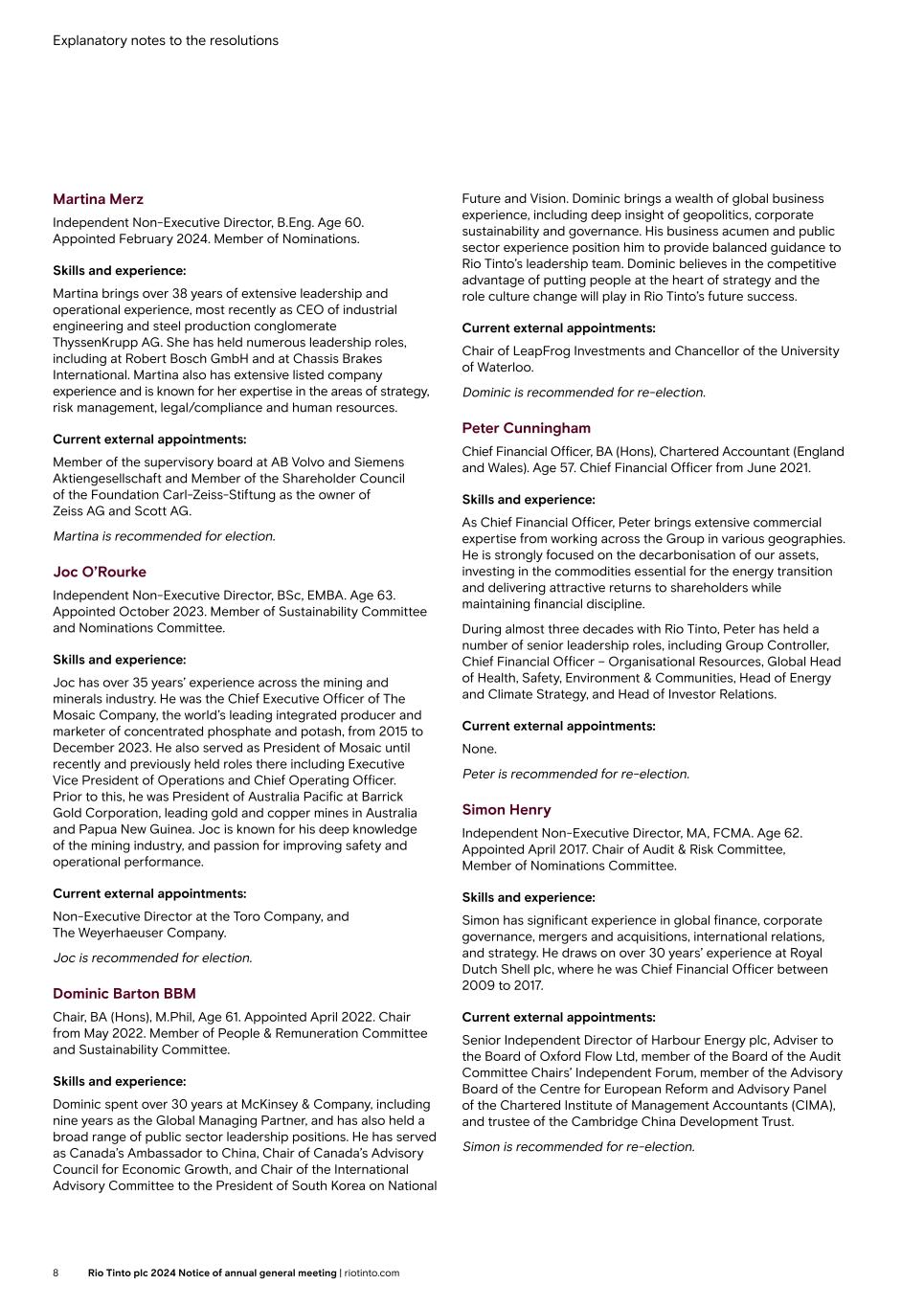 Explanatory notes to the resolutions Martina Merz Independent Non-Executive Director, B.Eng. Age 60. Appointed February 2024. Member of Nominations. Skills and experience: Martina brings over 38 years of extensive leadership and operational experience, most recently as CEO of industrial engineering and steel production conglomerate ThyssenKrupp AG. She has held numerous leadership roles, including at Robert Bosch GmbH and at Chassis Brakes International. Martina also has extensive listed company experience and is known for her expertise in the areas of strategy, risk management, legal/compliance and human resources. Current external appointments: Member of the supervisory board at AB Volvo and Siemens Aktiengesellschaft and Member of the Shareholder Council of the Foundation Carl-Zeiss-Stiftung as the owner of Zeiss AG and Scott AG. Martina is recommended for election. Joc O’Rourke Independent Non-Executive Director, BSc, EMBA. Age 63. Appointed October 2023. Member of Sustainability Committee and Nominations Committee. Skills and experience: Joc has over 35 years’ experience across the mining and minerals industry. He was the Chief Executive Officer of The Mosaic Company, the world’s leading integrated producer and marketer of concentrated phosphate and potash, from 2015 to December 2023. He also served as President of Mosaic until recently and previously held roles there including Executive Vice President of Operations and Chief Operating Officer. Prior to this, he was President of Australia Pacific at Barrick Gold Corporation, leading gold and copper mines in Australia and Papua New Guinea. Joc is known for his deep knowledge of the mining industry, and passion for improving safety and operational performance. Current external appointments: Non-Executive Director at the Toro Company, and The Weyerhaeuser Company. Joc is recommended for election. Dominic Barton BBM Chair, BA (Hons), M.Phil, Age 61. Appointed April 2022. Chair from May 2022. Member of People & Remuneration Committee and Sustainability Committee. Skills and experience: Dominic spent over 30 years at McKinsey & Company, including nine years as the Global Managing Partner, and has also held a broad range of public sector leadership positions. He has served as Canada’s Ambassador to China, Chair of Canada’s Advisory Council for Economic Growth, and Chair of the International Advisory Committee to the President of South Korea on National Future and Vision. Dominic brings a wealth of global business experience, including deep insight of geopolitics, corporate sustainability and governance. His business acumen and public sector experience position him to provide balanced guidance to Rio Tinto’s leadership team. Dominic believes in the competitive advantage of putting people at the heart of strategy and the role culture change will play in Rio Tinto’s future success. Current external appointments: Chair of LeapFrog Investments and Chancellor of the University of Waterloo. Dominic is recommended for re-election. Peter Cunningham Chief Financial Officer, BA (Hons), Chartered Accountant (England and Wales). Age 57. Chief Financial Officer from June 2021. Skills and experience: As Chief Financial Officer, Peter brings extensive commercial expertise from working across the Group in various geographies. He is strongly focused on the decarbonisation of our assets, investing in the commodities essential for the energy transition and delivering attractive returns to shareholders while maintaining financial discipline. During almost three decades with Rio Tinto, Peter has held a number of senior leadership roles, including Group Controller, Chief Financial Officer – Organisational Resources, Global Head of Health, Safety, Environment & Communities, Head of Energy and Climate Strategy, and Head of Investor Relations. Current external appointments: None. Peter is recommended for re-election. Simon Henry Independent Non-Executive Director, MA, FCMA. Age 62. Appointed April 2017. Chair of Audit & Risk Committee, Member of Nominations Committee. Skills and experience: Simon has significant experience in global finance, corporate governance, mergers and acquisitions, international relations, and strategy. He draws on over 30 years’ experience at Royal Dutch Shell plc, where he was Chief Financial Officer between 2009 to 2017. Current external appointments: Senior Independent Director of Harbour Energy plc, Adviser to the Board of Oxford Flow Ltd, member of the Board of the Audit Committee Chairs’ Independent Forum, member of the Advisory Board of the Centre for European Reform and Advisory Panel of the Chartered Institute of Management Accountants (CIMA), and trustee of the Cambridge China Development Trust. Simon is recommended for re-election. 8 Rio Tinto plc 2024 Notice of annual general meeting | riotinto.com