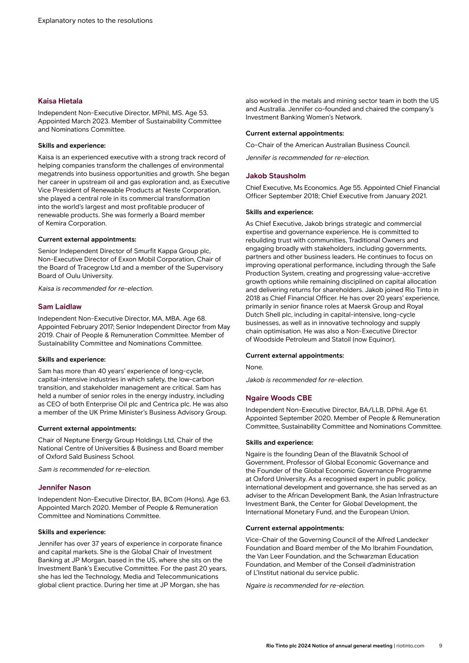 Explanatory notes to the resolutions Kaisa Hietala Independent Non-Executive Director, MPhil, MS. Age 53. Appointed March 2023. Member of Sustainability Committee and Nominations Committee. Skills and experience: Kaisa is an experienced executive with a strong track record of helping companies transform the challenges of environmental megatrends into business opportunities and growth. She began her career in upstream oil and gas exploration and, as Executive Vice President of Renewable Products at Neste Corporation, she played a central role in its commercial transformation into the world’s largest and most profitable producer of renewable products. She was formerly a Board member of Kemira Corporation. Current external appointments: Senior Independent Director of Smurfit Kappa Group plc, Non-Executive Director of Exxon Mobil Corporation, Chair of the Board of Tracegrow Ltd and a member of the Supervisory Board of Oulu University. Kaisa is recommended for re-election. Sam Laidlaw Independent Non-Executive Director, MA, MBA. Age 68. Appointed February 2017; Senior Independent Director from May 2019. Chair of People & Remuneration Committee. Member of Sustainability Committee and Nominations Committee. Skills and experience: Sam has more than 40 years’ experience of long-cycle, capital-intensive industries in which safety, the low-carbon transition, and stakeholder management are critical. Sam has held a number of senior roles in the energy industry, including as CEO of both Enterprise Oil plc and Centrica plc. He was also a member of the UK Prime Minister’s Business Advisory Group. Current external appointments: Chair of Neptune Energy Group Holdings Ltd, Chair of the National Centre of Universities & Business and Board member of Oxford Saïd Business School. Sam is recommended for re-election. Jennifer Nason Independent Non-Executive Director, BA, BCom (Hons). Age 63. Appointed March 2020. Member of People & Remuneration Committee and Nominations Committee. Skills and experience: Jennifer has over 37 years of experience in corporate finance and capital markets. She is the Global Chair of Investment Banking at JP Morgan, based in the US, where she sits on the Investment Bank’s Executive Committee. For the past 20 years, she has led the Technology, Media and Telecommunications global client practice. During her time at JP Morgan, she has also worked in the metals and mining sector team in both the US and Australia. Jennifer co-founded and chaired the company’s Investment Banking Women’s Network. Current external appointments: Co-Chair of the American Australian Business Council. Jennifer is recommended for re-election. Jakob Stausholm Chief Executive, Ms Economics. Age 55. Appointed Chief Financial Officer September 2018; Chief Executive from January 2021. Skills and experience: As Chief Executive, Jakob brings strategic and commercial expertise and governance experience. He is committed to rebuilding trust with communities, Traditional Owners and engaging broadly with stakeholders, including governments, partners and other business leaders. He continues to focus on improving operational performance, including through the Safe Production System, creating and progressing value-accretive growth options while remaining disciplined on capital allocation and delivering returns for shareholders. Jakob joined Rio Tinto in 2018 as Chief Financial Officer. He has over 20 years’ experience, primarily in senior finance roles at Maersk Group and Royal Dutch Shell plc, including in capital-intensive, long-cycle businesses, as well as in innovative technology and supply chain optimisation. He was also a Non-Executive Director of Woodside Petroleum and Statoil (now Equinor). Current external appointments: None. Jakob is recommended for re-election. Ngaire Woods CBE Independent Non-Executive Director, BA/LLB, DPhil. Age 61. Appointed September 2020. Member of People & Remuneration Committee, Sustainability Committee and Nominations Committee. Skills and experience: Ngaire is the founding Dean of the Blavatnik School of Government, Professor of Global Economic Governance and the Founder of the Global Economic Governance Programme at Oxford University. As a recognised expert in public policy, international development and governance, she has served as an adviser to the African Development Bank, the Asian Infrastructure Investment Bank, the Center for Global Development, the International Monetary Fund, and the European Union. Current external appointments: Vice-Chair of the Governing Council of the Alfred Landecker Foundation and Board member of the Mo Ibrahim Foundation, the Van Leer Foundation, and the Schwarzman Education Foundation, and Member of the Conseil d’administration of L’Institut national du service public. Ngaire is recommended for re-election. 9Rio Tinto plc 2024 Notice of annual general meeting | riotinto.com