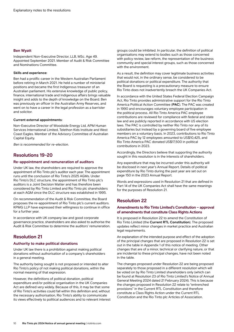 Explanatory notes to the resolutions Ben Wyatt Independent Non-Executive Director, LLB, MSc. Age 49. Appointed September 2021. Member of Audit & Risk Committee and Nominations Committee. Skills and experience: Ben had a prolific career in the Western Australian Parliament before retiring in March 2021. He held a number of ministerial positions and became the first Indigenous treasurer of an Australian parliament. His extensive knowledge of public policy, finance, international trade and Indigenous affairs brings valuable insight and adds to the depth of knowledge on the Board. Ben was previously an officer in the Australian Army Reserves, and went on to have a career in the legal profession as a barrister and solicitor. Current external appointments: Non-Executive Director of Woodside Energy Ltd, APM Human Services International Limited, Telethon Kids Institute and West Coast Eagles. Member of the Advisory Committee of Australian Capital Equity. Ben is recommended for re-election. Resolutions 19-20 Re-appointment and remuneration of auditors Under UK law, the shareholders are required to approve the appointment of Rio Tinto plc’s auditor each year. The appointment runs until the conclusion of Rio Tinto’s 2025 AGMs. Under Rio Tinto’s DLC structure, the appointment of Rio Tinto plc’s auditors is a Joint Decision Matter and has therefore been considered by Rio Tinto Limited and Rio Tinto plc shareholders at each AGM since the DLC structure was established in 1995. On recommendation of the Audit & Risk Committee, the Board proposes the re-appointment of Rio Tinto plc’s current auditors. KPMG LLP have expressed their willingness to continue in office for a further year. In accordance with UK company law and good corporate governance practice, shareholders are also asked to authorise the Audit & Risk Committee to determine the auditors’ remuneration. Resolution 21 Authority to make political donations Under UK law there is a prohibition against making political donations without authorisation of a company’s shareholders in a general meeting. The authority being sought is not proposed or intended to alter Rio Tinto’s policy of not making political donations, within the normal meaning of that expression. However, the definitions of political donation, political expenditure and/or political organisation in the UK Companies Act are defined very widely. Because of this, it may be that some of Rio Tinto’s activities could fall within this definition and, without the necessary authorisation, Rio Tinto’s ability to communicate its views effectively to political audiences and to relevant interest groups could be inhibited. In particular, the definition of political organisations may extend to bodies such as those concerned with policy review, law reform, the representation of the business community and special interest groups, such as those concerned with the environment. As a result, the definition may cover legitimate business activities that would not, in the ordinary sense, be considered to be political donations or political expenditure. The authority that the Board is requesting is a precautionary measure to ensure Rio Tinto does not inadvertently breach the UK Companies Act. In accordance with the United States Federal Election Campaign Act, Rio Tinto provides administrative support for the Rio Tinto America Political Action Committee (PAC). The PAC was created in 1990 and encourages voluntary employee participation in the political process. All Rio Tinto America PAC employee contributions are reviewed for compliance with federal and state law and are publicly reported in accordance with US election laws. The PAC is controlled by neither Rio Tinto nor any of its subsidiaries but instead by a governing board of five employee members on a voluntary basis. In 2023, contributions to Rio Tinto America PAC by 12 employees amounted to US$10,425, and Rio Tinto America PAC donated US$17,500 in political contributions in 2023. Accordingly, the Directors believe that supporting the authority sought in this resolution is in the interests of shareholders. Any expenditure that may be incurred under this authority will be disclosed in next year’s Annual Report. Details of political expenditure by Rio Tinto during the past year are set out on page 150 in the 2023 Annual Report. Words and expressions used in Resolution 21 that are defined in Part 14 of the UK Companies Act shall have the same meanings for the purposes of Resolution 21. Resolution 22 Amendments to Rio Tinto Limited’s Constitution – approval of amendments that constitute Class Rights Actions It is proposed in Resolution 22 to amend the Constitution of Rio Tinto Limited (the Current RTL Constitution). The proposed updates reflect minor changes in market practice and Australian legal requirements. An explanation of the intended purpose and effect of the adoption of the principal changes that are proposed in Resolution 22 is set out in the table in Appendix 1 of this notice of meeting. Other changes that are of a minor, technical or clarifying nature, or that are incidental to these principal changes, have not been noted in the table. The changes proposed under Resolution 22 are being proposed separately to those proposed in a different resolution which will be voted on by Rio Tinto Limited shareholders only (which can be found at Resolution 23 of Rio Tinto Limited’s Notice of Annual General Meeting 2024 dated 21 February 2024). This is because the changes proposed in Resolution 22 relate to “entrenched provisions” in the Current RTL Constitution and therefore constitute a Class Rights Action under the Current RTL Constitution and the Rio Tinto plc Articles of Association. 10 Rio Tinto plc 2024 Notice of annual general meeting | riotinto.com