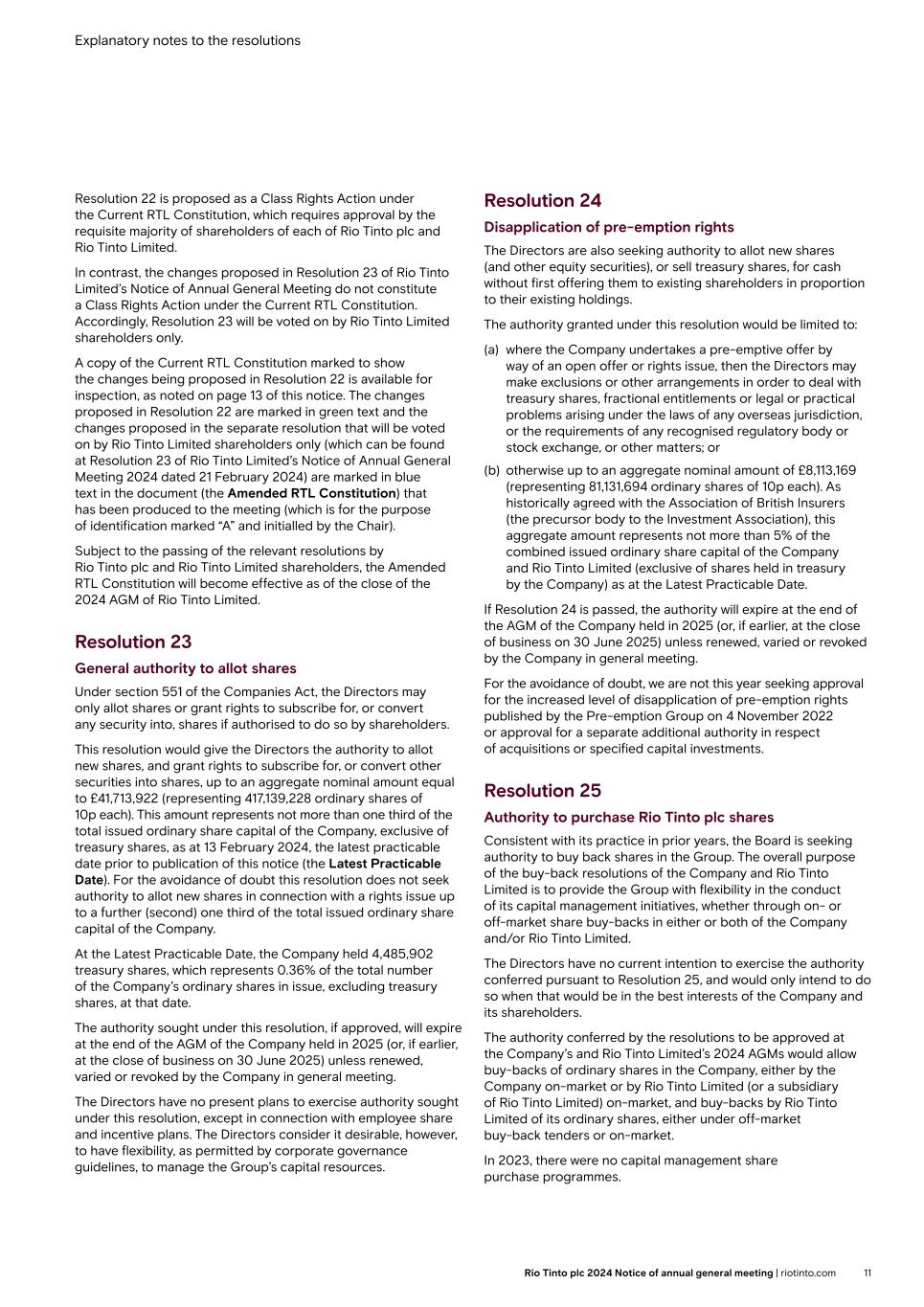 Explanatory notes to the resolutions Resolution 22 is proposed as a Class Rights Action under the Current RTL Constitution, which requires approval by the requisite majority of shareholders of each of Rio Tinto plc and Rio Tinto Limited. In contrast, the changes proposed in Resolution 23 of Rio Tinto Limited’s Notice of Annual General Meeting do not constitute a Class Rights Action under the Current RTL Constitution. Accordingly, Resolution 23 will be voted on by Rio Tinto Limited shareholders only. A copy of the Current RTL Constitution marked to show the changes being proposed in Resolution 22 is available for inspection, as noted on page 13 of this notice. The changes proposed in Resolution 22 are marked in green text and the changes proposed in the separate resolution that will be voted on by Rio Tinto Limited shareholders only (which can be found at Resolution 23 of Rio Tinto Limited’s Notice of Annual General Meeting 2024 dated 21 February 2024) are marked in blue text in the document (the Amended RTL Constitution) that has been produced to the meeting (which is for the purpose of identification marked “A” and initialled by the Chair). Subject to the passing of the relevant resolutions by Rio Tinto plc and Rio Tinto Limited shareholders, the Amended RTL Constitution will become effective as of the close of the 2024 AGM of Rio Tinto Limited. Resolution 23 General authority to allot shares Under section 551 of the Companies Act, the Directors may only allot shares or grant rights to subscribe for, or convert any security into, shares if authorised to do so by shareholders. This resolution would give the Directors the authority to allot new shares, and grant rights to subscribe for, or convert other securities into shares, up to an aggregate nominal amount equal to £41,713,922 (representing 417,139,228 ordinary shares of 10p each). This amount represents not more than one third of the total issued ordinary share capital of the Company, exclusive of treasury shares, as at 13 February 2024, the latest practicable date prior to publication of this notice (the Latest Practicable Date). For the avoidance of doubt this resolution does not seek authority to allot new shares in connection with a rights issue up to a further (second) one third of the total issued ordinary share capital of the Company. At the Latest Practicable Date, the Company held 4,485,902 treasury shares, which represents 0.36% of the total number of the Company’s ordinary shares in issue, excluding treasury shares, at that date. The authority sought under this resolution, if approved, will expire at the end of the AGM of the Company held in 2025 (or, if earlier, at the close of business on 30 June 2025) unless renewed, varied or revoked by the Company in general meeting. The Directors have no present plans to exercise authority sought under this resolution, except in connection with employee share and incentive plans. The Directors consider it desirable, however, to have flexibility, as permitted by corporate governance guidelines, to manage the Group’s capital resources. Resolution 24 Disapplication of pre-emption rights The Directors are also seeking authority to allot new shares (and other equity securities), or sell treasury shares, for cash without first offering them to existing shareholders in proportion to their existing holdings. The authority granted under this resolution would be limited to: (a) where the Company undertakes a pre-emptive offer by way of an open offer or rights issue, then the Directors may make exclusions or other arrangements in order to deal with treasury shares, fractional entitlements or legal or practical problems arising under the laws of any overseas jurisdiction, or the requirements of any recognised regulatory body or stock exchange, or other matters; or (b) otherwise up to an aggregate nominal amount of £8,113,169 (representing 81,131,694 ordinary shares of 10p each). As historically agreed with the Association of British Insurers (the precursor body to the Investment Association), this aggregate amount represents not more than 5% of the combined issued ordinary share capital of the Company and Rio Tinto Limited (exclusive of shares held in treasury by the Company) as at the Latest Practicable Date. If Resolution 24 is passed, the authority will expire at the end of the AGM of the Company held in 2025 (or, if earlier, at the close of business on 30 June 2025) unless renewed, varied or revoked by the Company in general meeting. For the avoidance of doubt, we are not this year seeking approval for the increased level of disapplication of pre-emption rights published by the Pre-emption Group on 4 November 2022 or approval for a separate additional authority in respect of acquisitions or specified capital investments. Resolution 25 Authority to purchase Rio Tinto plc shares Consistent with its practice in prior years, the Board is seeking authority to buy back shares in the Group. The overall purpose of the buy-back resolutions of the Company and Rio Tinto Limited is to provide the Group with flexibility in the conduct of its capital management initiatives, whether through on- or off-market share buy-backs in either or both of the Company and/or Rio Tinto Limited. The Directors have no current intention to exercise the authority conferred pursuant to Resolution 25, and would only intend to do so when that would be in the best interests of the Company and its shareholders. The authority conferred by the resolutions to be approved at the Company’s and Rio Tinto Limited’s 2024 AGMs would allow buy-backs of ordinary shares in the Company, either by the Company on-market or by Rio Tinto Limited (or a subsidiary of Rio Tinto Limited) on-market, and buy-backs by Rio Tinto Limited of its ordinary shares, either under off-market buy-back tenders or on-market. In 2023, there were no capital management share purchase programmes. 11Rio Tinto plc 2024 Notice of annual general meetin
