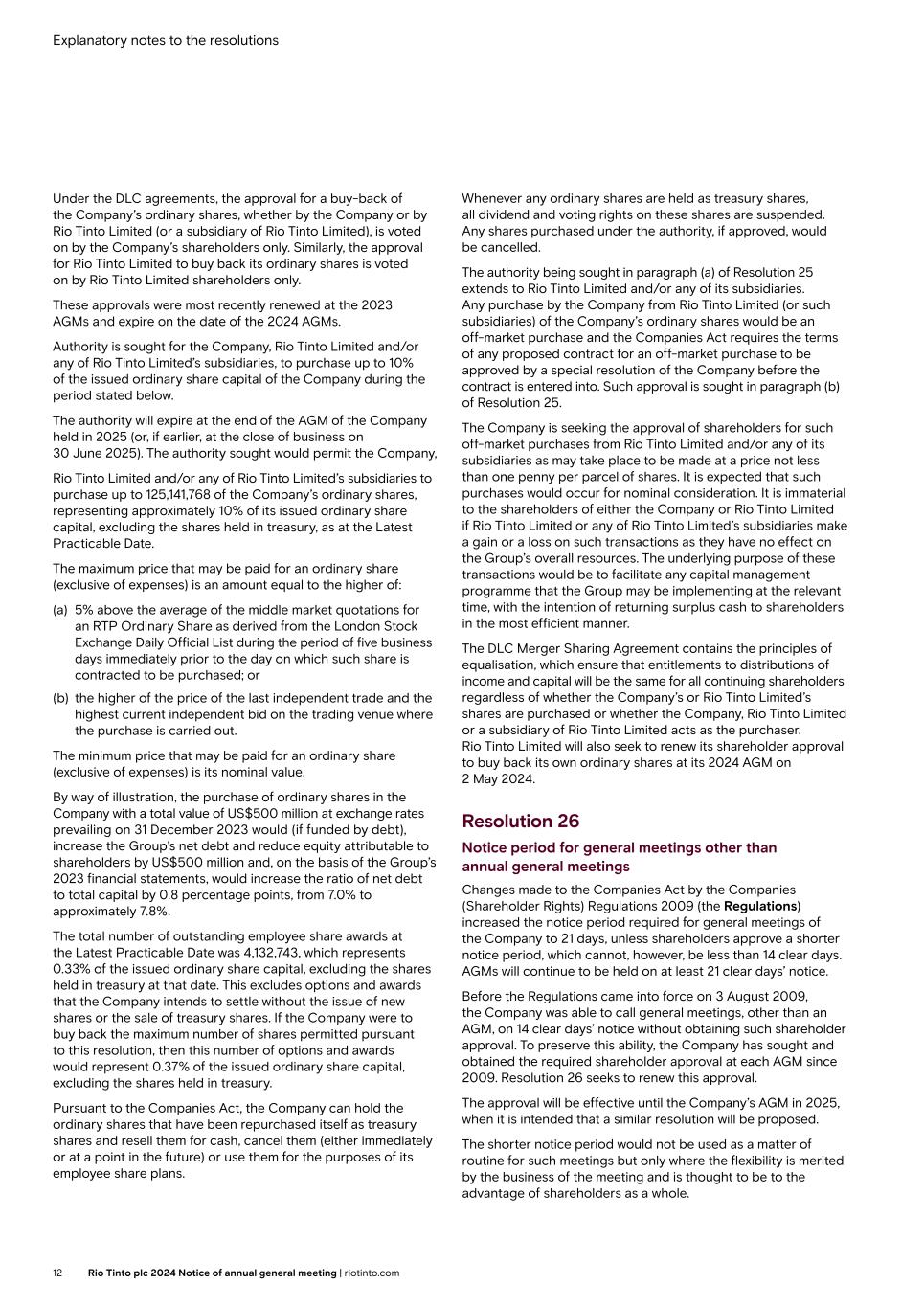 Explanatory notes to the resolutions Under the DLC agreements, the approval for a buy-back of the Company’s ordinary shares, whether by the Company or by Rio Tinto Limited (or a subsidiary of Rio Tinto Limited), is voted on by the Company’s shareholders only. Similarly, the approval for Rio Tinto Limited to buy back its ordinary shares is voted on by Rio Tinto Limited shareholders only. These approvals were most recently renewed at the 2023 AGMs and expire on the date of the 2024 AGMs. Authority is sought for the Company, Rio Tinto Limited and/or any of Rio Tinto Limited’s subsidiaries, to purchase up to 10% of the issued ordinary share capital of the Company during the period stated below. The authority will expire at the end of the AGM of the Company held in 2025 (or, if earlier, at the close of business on 30 June 2025). The authority sought would permit the Company, Rio Tinto Limited and/or any of Rio Tinto Limited’s subsidiaries to purchase up to 125,141,768 of the Company’s ordinary shares, representing approximately 10% of its issued ordinary share capital, excluding the shares held in treasury, as at the Latest Practicable Date. The maximum price that may be paid for an ordinary share (exclusive of expenses) is an amount equal to the higher of: (a) 5% above the average of the middle market quotations for an RTP Ordinary Share as derived from the London Stock Exchange Daily Official List during the period of five business days immediately prior to the day on which such share is contracted to be purchased; or (b) the higher of the price of the last independent trade and the highest current independent bid on the trading venue where the purchase is carried out. The minimum price that may be paid for an ordinary share (exclusive of expenses) is its nominal value. By way of illustration, the purchase of ordinary shares in the Company with a total value of US$500 million at exchange rates prevailing on 31 December 2023 would (if funded by debt), increase the Group’s net debt and reduce equity attributable to shareholders by US$500 million and, on the basis of the Group’s 2023 financial statements, would increase the ratio of net debt to total capital by 0.8 percentage points, from 7.0% to approximately 7.8%. The total number of outstanding employee share awards at the Latest Practicable Date was 4,132,743, which represents 0.33% of the issued ordinary share capital, excluding the shares held in treasury at that date. This excludes options and awards that the Company intends to settle without the issue of new shares or the sale of treasury shares. If the Company were to buy back the maximum number of shares permitted pursuant to this resolution, then this number of options and awards would represent 0.37% of the issued ordinary share capital, excluding the shares held in treasury. Pursuant to the Companies Act, the Company can hold the ordinary shares that have been repurchased itself as treasury shares and resell them for cash, cancel them (either immediately or at a point in the future) or use them for the purposes of its employee share plans. Whenever any ordinary shares are held as treasury shares, all dividend and voting rights on these shares are suspended. Any shares purchased under the authority, if approved, would be cancelled. The authority being sought in paragraph (a) of Resolution 25 extends to Rio Tinto Limited and/or any of its subsidiaries. Any purchase by the Company from Rio Tinto Limited (or such subsidiaries) of the Company’s ordinary shares would be an off-market purchase and the Companies Act requires the terms of any proposed contract for an off-market purchase to be approved by a special resolution of the Company before the contract is entered into. Such approval is sought in paragraph (b) of Resolution 25. The Company is seeking the approval of shareholders for such off-market purchases from Rio Tinto Limited and/or any of its subsidiaries as may take place to be made at a price not less than one penny per parcel of shares. It is expected that such purchases would occur for nominal consideration. It is immaterial to the shareholders of either the Company or Rio Tinto Limited if Rio Tinto Limited or any of Rio Tinto Limited’s subsidiaries make a gain or a loss on such transactions as they have no effect on the Group’s overall resources. The underlying purpose of these transactions would be to facilitate any capital management programme that the Group may be implementing at the relevant time, with the intention of returning surplus cash to shareholders in the most efficient manner. The DLC Merger Sharing Agreement contains the principles of equalisation, which ensure that entitlements to distributions of income and capital will be the same for all continuing shareholders regardless of whether the Company’s or Rio Tinto Limited’s shares are purchased or whether the Company, Rio Tinto Limited or a subsidiary of Rio Tinto Limited acts as the purchaser. Rio Tinto Limited will also seek to renew its shareholder approval to buy back its own ordinary shares at its 2024 AGM on 2 May 2024. Resolution 26 Notice period for general meetings other than annual general meetings Changes made to the Companies Act by the Companies (Shareholder Rights) Regulations 2009 (the Regulations) increased the notice period required for general meetings of the Company to 21 days, unless shareholders approve a shorter notice period, which cannot, however, be less than 14 clear days. AGMs will continue to be held on at least 21 clear days’ notice. Before the Regulations came into force on 3 August 2009, the Company was able to call general meetings, other than an AGM, on 14 clear days’ notice without obtaining such shareholder approval. To preserve this ability, the Company has sought and obtained the required shareholder approval at each AGM since 2009. Resolution 26 seeks to renew this approval. The approval will be effective until the Company’s AGM in 2025, when