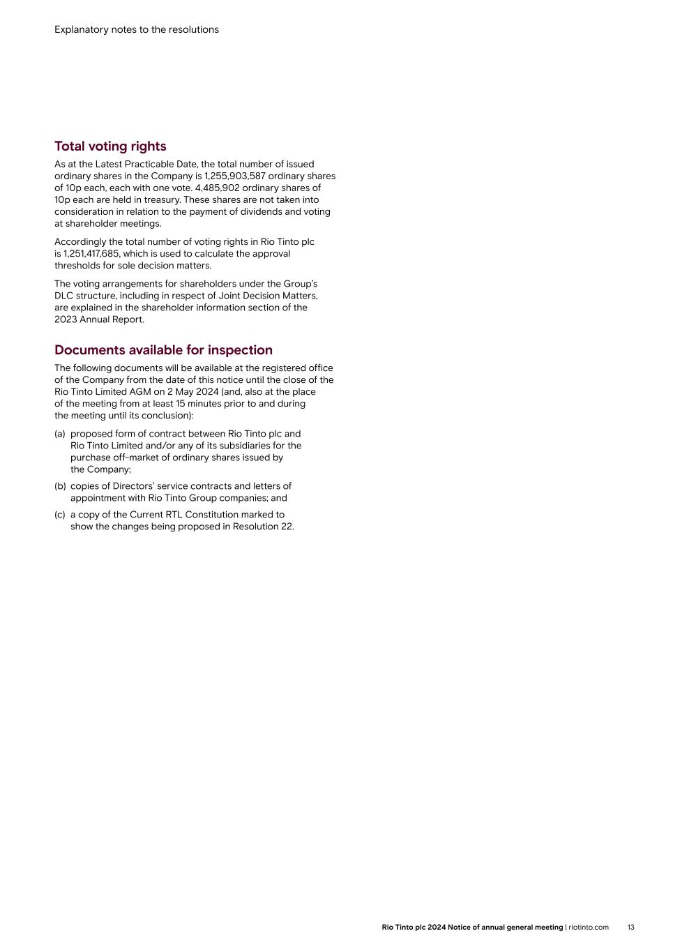 Explanatory notes to the resolutions Total voting rights As at the Latest Practicable Date, the total number of issued ordinary shares in the Company is 1,255,903,587 ordinary shares of 10p each, each with one vote. 4,485,902 ordinary shares of 10p each are held in treasury. These shares are not taken into consideration in relation to the payment of dividends and voting at shareholder meetings. Accordingly the total number of voting rights in Rio Tinto plc is 1,251,417,685, which is used to calculate the approval thresholds for sole decision matters. The voting arrangements for shareholders under the Group’s DLC structure, including in respect of Joint Decision Matters, are explained in the shareholder information section of the 2023 Annual Report. Documents available for inspection The following documents will be available at the registered office of the Company from the date of this notice until the close of the Rio Tinto Limited AGM on 2 May 2024 (and, also at the place of the meeting from at least 15 minutes prior to and during the meeting until its conclusion): (a) proposed form of contract between Rio Tinto plc and Rio Tinto Limited and/or any of its subsidiaries for the purchase off-market of ordinary shares issued by the Company; (b) copies of Directors’ service contracts and letters of appointment with Rio Tinto Group companies; and (c) a copy of the Current RTL Constitution marked to show the changes being proposed in Resolution 22. 13Rio Tinto plc 2024 Notice of annual general meeting | riotinto.com