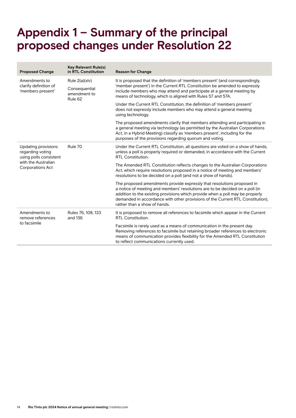 Appendix 1 – Summary of the principal proposed changes under Resolution 22 Proposed Change Key Relevant Rule(s) in RTL Constitution Reason for Change Amendments to clarify definition of ‘members present’ Rule 2(a)(xlv) Consequential amendment to Rule 62 It is proposed that the definition of ‘members present’ (and correspondingly, ‘member present’) in the Current RTL Constitution be amended to expressly include members who may attend and participate at a general meeting by means of technology, which is aligned with Rules 57 and 57A. Under the Current RTL Constitution, the definition of ‘members present’ does not expressly include members who may attend a general meeting using technology. The proposed amendments clarify that members attending and participating in a general meeting via technology (as permitted by the Australian Corporations Act, in a Hybrid Meeting) classify as ‘members present’, including for the purposes of the provisions regarding quorum and voting. Updating provisions regarding voting using polls consistent with the Australian Corporations Act Rule 70 Under the Current RTL Constitution, all questions are voted on a show of hands, unless a poll is properly required or demanded, in accordance with the Current RTL Constitution. The Amended RTL Constitution reflects changes to the Australian Corporations Act, which require resolutions proposed in a notice of meeting and members’ resolutions to be decided on a poll (and not a show of hands). The proposed amendments provide expressly that resolutions proposed in a notice of meeting and members’ resolutions are to be decided on a poll (in addition to the existing provisions which provide when a poll may be properly demanded in accordance with other provisions of the Current RTL Constitution), rather than a show of hands. Amendments to remove references to facsimile Rules 76, 108, 133 and 136 It is proposed to remove all references to facsimile which appear in the Current RTL Constitution. Facsimile is rarely used as a means of communication in the present day. Removing references to facsimile but retaining broader references to electronic means of communication provides flexibility for the Amended RTL Constitution to reflect communications currently used. 14 Rio Tinto plc 2024 Notice of annual general meeting | riotinto.com